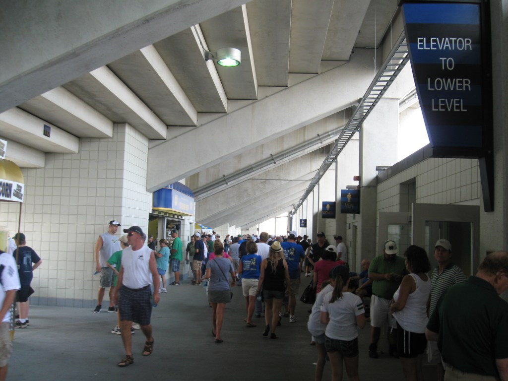 The covered first level concourse is tall and wide as it features a brick inside wall filled with inlets on various honors, championships and achievements (more on that in “Displays”). On the outer edges of the concourse are very long ramps that bring you to the top level of the stadium and it takes a while to get there (there are also a couple middle concourses, but they do not encircle the stadium). At the top, is a smaller concourse that is outdoors, but mostly protected from precipitation thanks to the seating bowl. Having this much space for a one-level stadium is pretty good even if things get crowded at times up top. In terms of the design, yeah it’s plain, but it fits the stadium and tradition here.