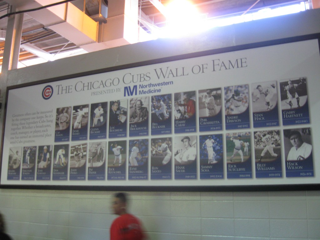 Four statues at each gate are a real nice touch as they honor Harry Caray, Ron Santo, Billy Williams and Ernie Banks. Wrigley Field does an excellent job of honoring its past with flags around the stadium, though it’s not always clear what they represent. On top of the roof over the main seating bowl are many flags with years denoting World Series, League and Division Championships. However, I can’t figure out the red, white and blue color scheme in that some of the same accomplishments have different colored flags. A display in the concourse, defines each flag’s accomplishment, but it still doesn’t explain the odd color scheme. Anyway, the concourse also features honors with a nice and simple Wall of Fame, honoring accomplished Cubs of all types. Back in the ballpark, on top of the foul poles are the retired numbers of Ernie Banks, Billy Williams, Ron Santo, Ryne Sandberg, Ferguson Jenkins and Greg Maddux. Over centerfield and above the scoreboard are the flags of each team in the National League, organized by current division standings. Lastly and most importantly, high atop the scoreboard, a white flag with a blue W is flown after a win. However, lately the blue flag with the white L has been up more times than not.
