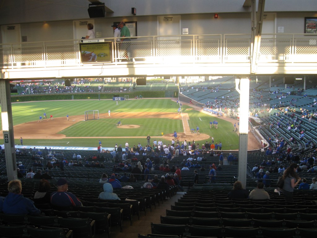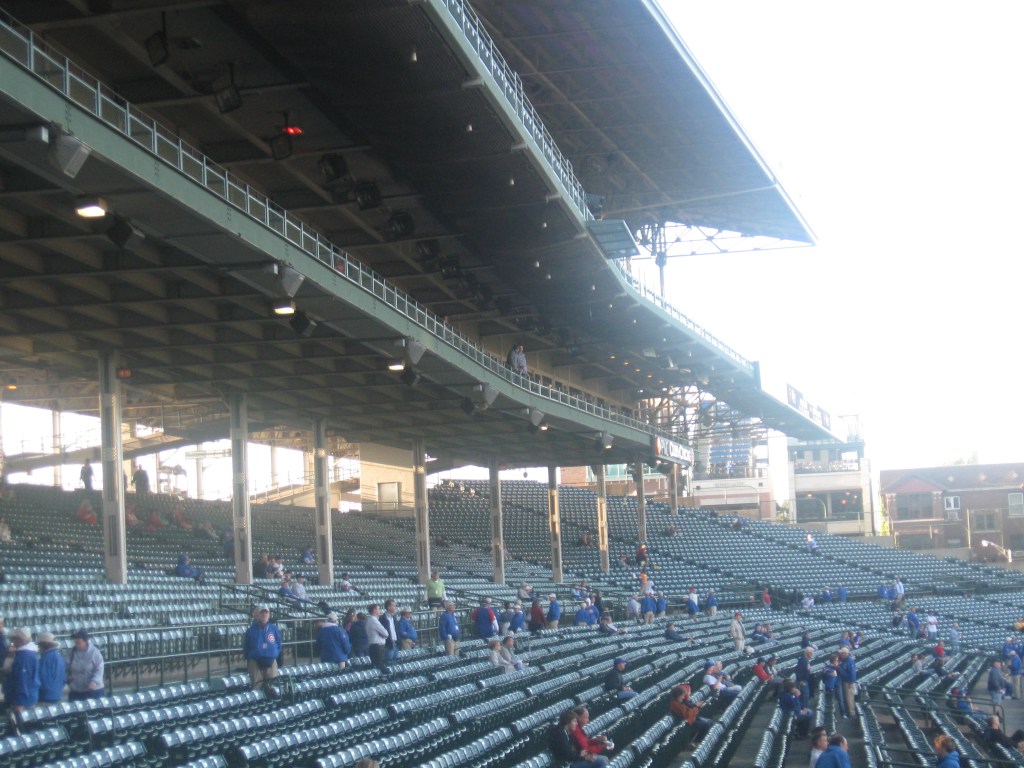 Inside the Friendly Confines, is an old ballpark that has gotten better with age. There are two decks at Wrigley, and much of the seating is in the gently-sloped first level. Green seats are certainly newer, helping with width. The leg room is still a bit tight. This lower deck extends from foul pole to foul pole and is angled inwards nicely at the corners. There are two walkways that separate the first level seating into 10s, 100s and 200s. The 200 section is unique in that a lot of it is covered by the upper deck and if you’re really far back, fans are only able to see the grass with fly balls completely obstructed. It goes without saying that these are poor seats and there are a good handful of them. In these areas, TV screens and digital scoreboards hang down from the ceiling to assist. Exposed beams are everywhere adding to both the nostalgia of this ballpark and the poor sightlines in these sections. Behind these seats is another walkway and there are ramps that lead you to the upper deck. I liked these seats the best as they have a great, close perspective and are split into 400s and 500s by a walkway. Many of the seats are covered by a roof. Behind home plate in the upper deck is the press box and between the two decks of seating, are mezzanine suites, neatly tucked away from view (there is a club at the end of the suites). This by far is the closest upper deck in baseball in terms of proximity to the field. In the outfield, are the famed bleachers and there is an extra few sets of bleachers higher up beyond the batters eye in Center. I didn’t like how these inaccessible to those that didn’t have a ticket. Looking outside of the ballpark, you can see the bleachers on top of those buildings on Waveland and Sheffield and then the rest of the view is comprised of the high-rises towards the Lakeshore.