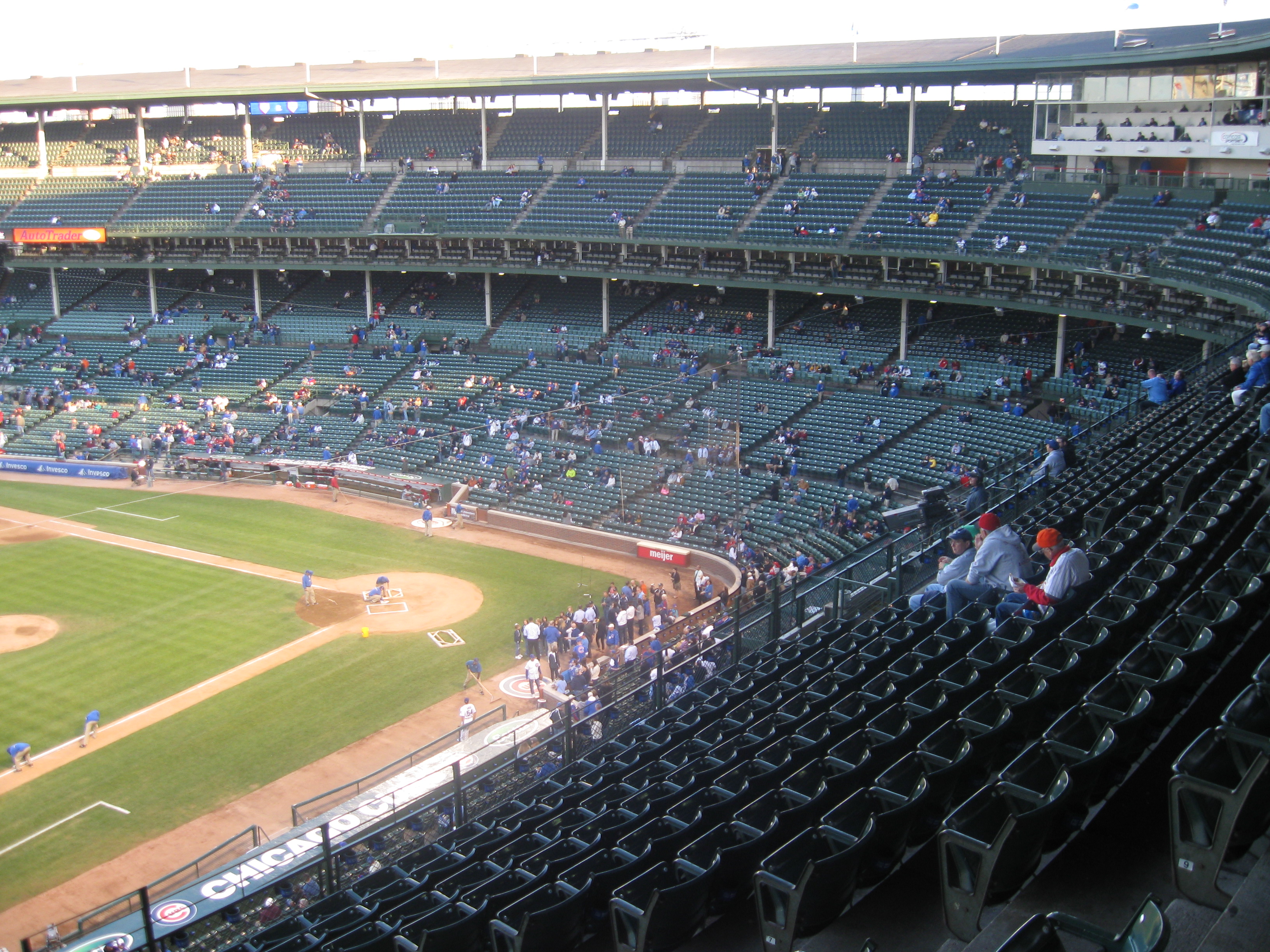 Inside the Friendly Confines, is an old ballpark that has gotten better with age. There are two decks at Wrigley, and much of the seating is in the gently-sloped first level. Green seats are certainly newer, helping with width. The leg room is still a bit tight. This lower deck extends from foul pole to foul pole and is angled inwards nicely at the corners. There are two walkways that separate the first level seating into 10s, 100s and 200s. The 200 section is unique in that a lot of it is covered by the upper deck and if you’re really far back, fans are only able to see the grass with fly balls completely obstructed. It goes without saying that these are poor seats and there are a good handful of them. In these areas, TV screens and digital scoreboards hang down from the ceiling to assist. Exposed beams are everywhere adding to both the nostalgia of this ballpark and the poor sightlines in these sections. Behind these seats is another walkway and there are ramps that lead you to the upper deck. I liked these seats the best as they have a great, close perspective and are split into 400s and 500s by a walkway. Many of the seats are covered by a roof. Behind home plate in the upper deck is the press box and between the two decks of seating, are mezzanine suites, neatly tucked away from view (there is a club at the end of the suites). This by far is the closest upper deck in baseball in terms of proximity to the field. In the outfield, are the famed bleachers and there is an extra few sets of bleachers higher up beyond the batters eye in Center. I didn’t like how these inaccessible to those that didn’t have a ticket. Looking outside of the ballpark, you can see the bleachers on top of those buildings on Waveland and Sheffield and then the rest of the view is comprised of the high-rises towards the Lakeshore.
