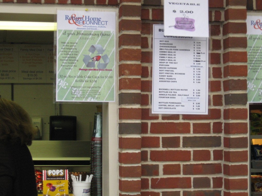 A Bucknell football game is very affordable with a reserved seat going for $10 and general admission running $8. Parking was free and the programs were $3. Concessions were cheap too ($4 for a cheeseburger, $1.50 for a bottled water).