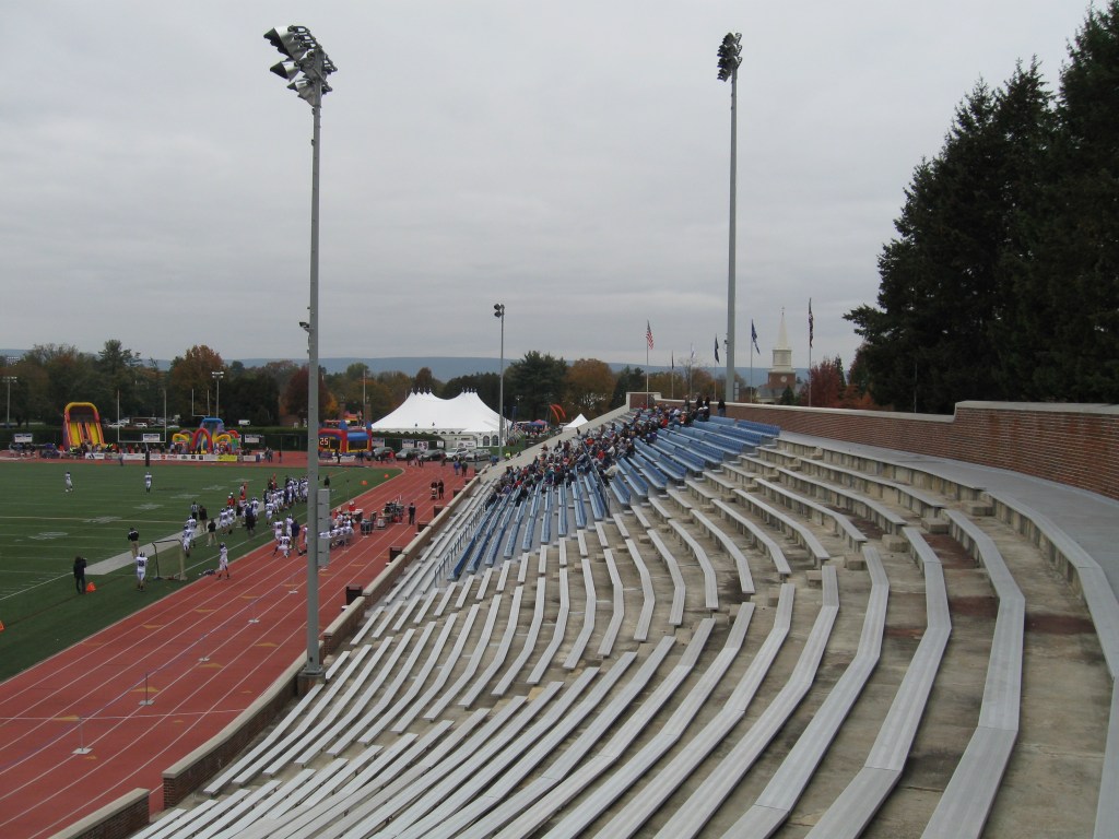 The surrounding track keeps the seats a little further from the action and the bowl is designed as a one-level partial horseshoe. Seats are mostly bleachers that have an odd look as the ones nearest to the main entrance are cleaner while further away towards the South end zone, it looks like the concrete that the bleachers are set on need a good scrubbing. In between is reserved seating with small individual seats in blue. I should emphasize small as they were a tight squeeze, almost not even worth leaving the bleachers. A walkway at the top of the seating surrounds much of the stadium. The nicest part at Christy-Mathewson Memorial Stadium is the South end zone where the partial horseshoe had its seats removed for crafty landscaping that has BUCKNELL spelled out in the shrubs. The other end zone is open and full with kids’ activities like a bounce house and a slide. A small press box is located on the West sideline and its white face has the Bison logo along with a Bucknell script. The outside view is pleasant with some trees overhanging along with views of the surrounding campus buildings.