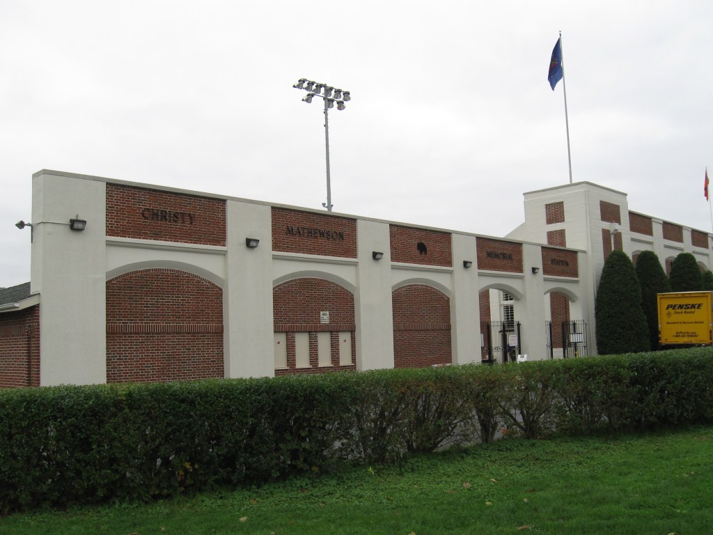 On a chilly, cloudy late October day it was off to the rolling hills of Central Pennsylvania for a stadium doubleheader starting in Lewisburg for a Bucknell football game. The small, Liberal Arts school is private and a very good one. After coming to see Sojka Pavilion and Bison basketball a few years ago, this was my second visit into the area. The Bison don’t exactly have the success that the school’s basketball team does as they have won only one Patriot League title and that came nearly 15 years ago. Their home is Christy Mathewson Memorial Stadium, a venue built in 1924, renovated in 1989 and named after the famous Bucknell Alum who went on to become one of the first members of the National Baseball Hall of Fame.