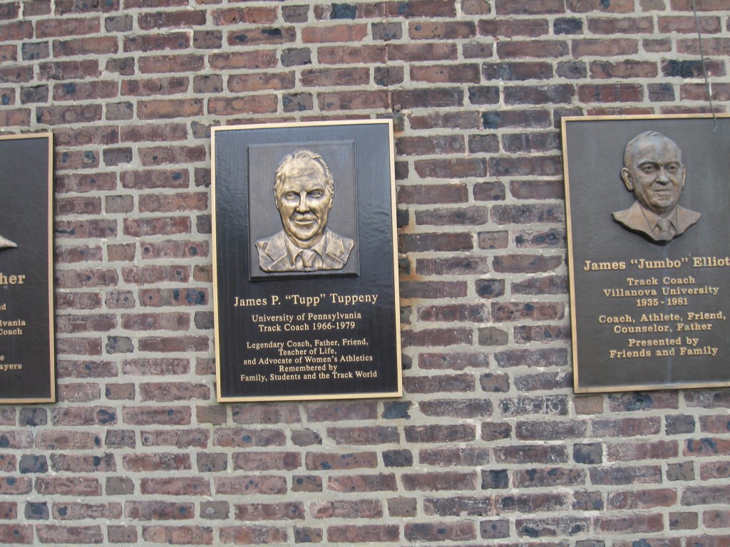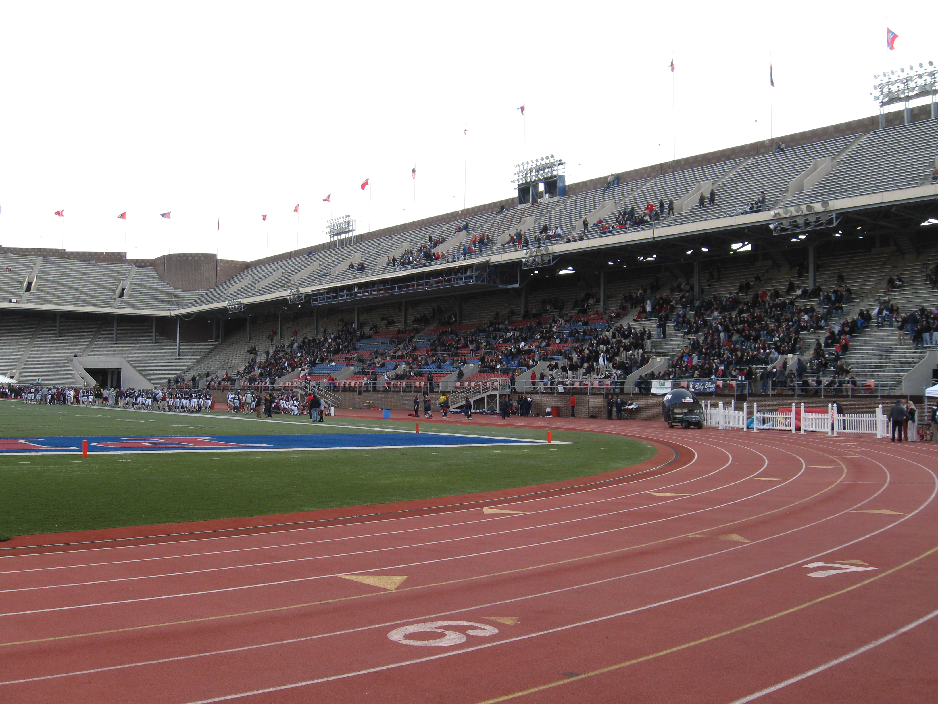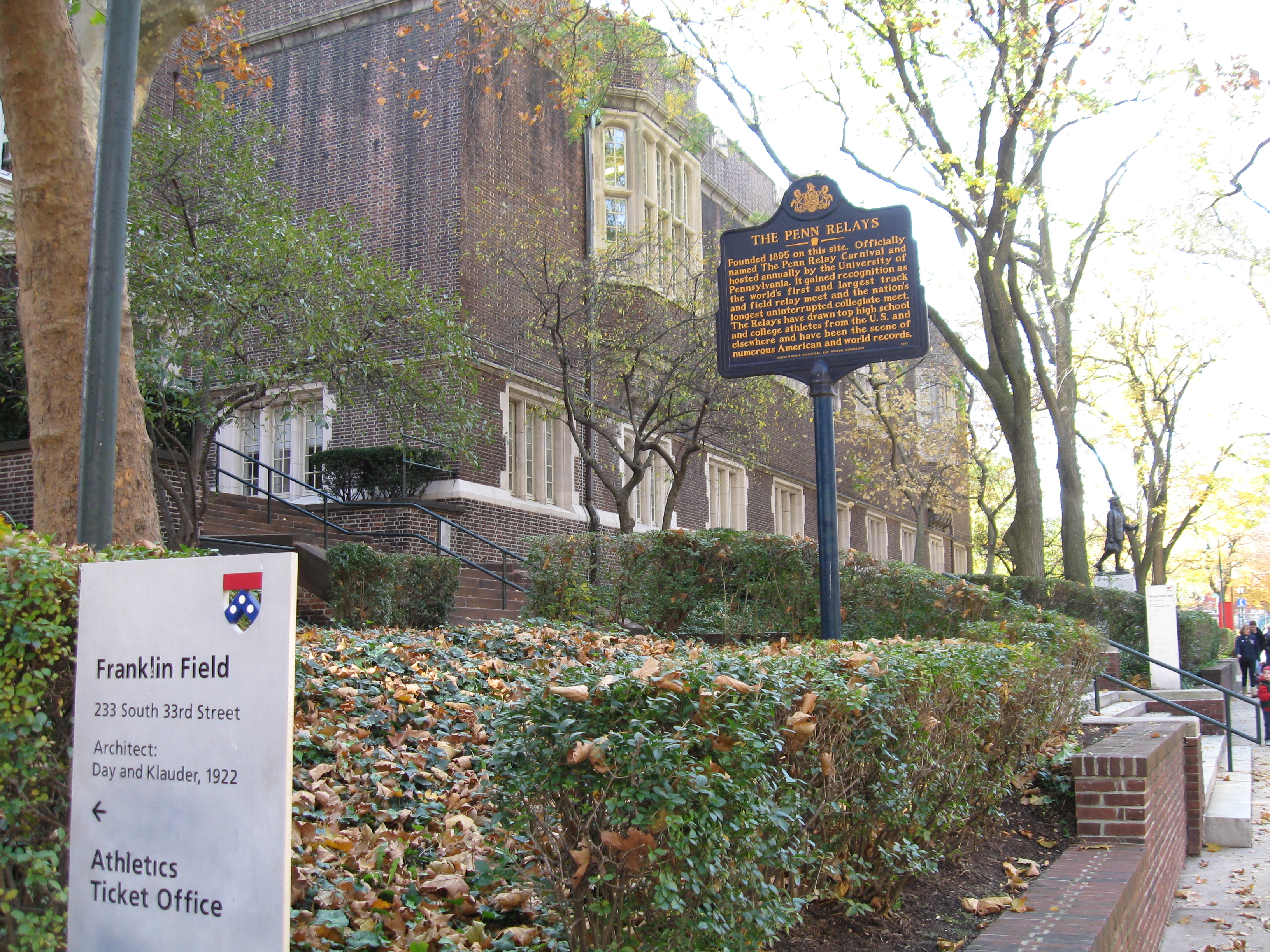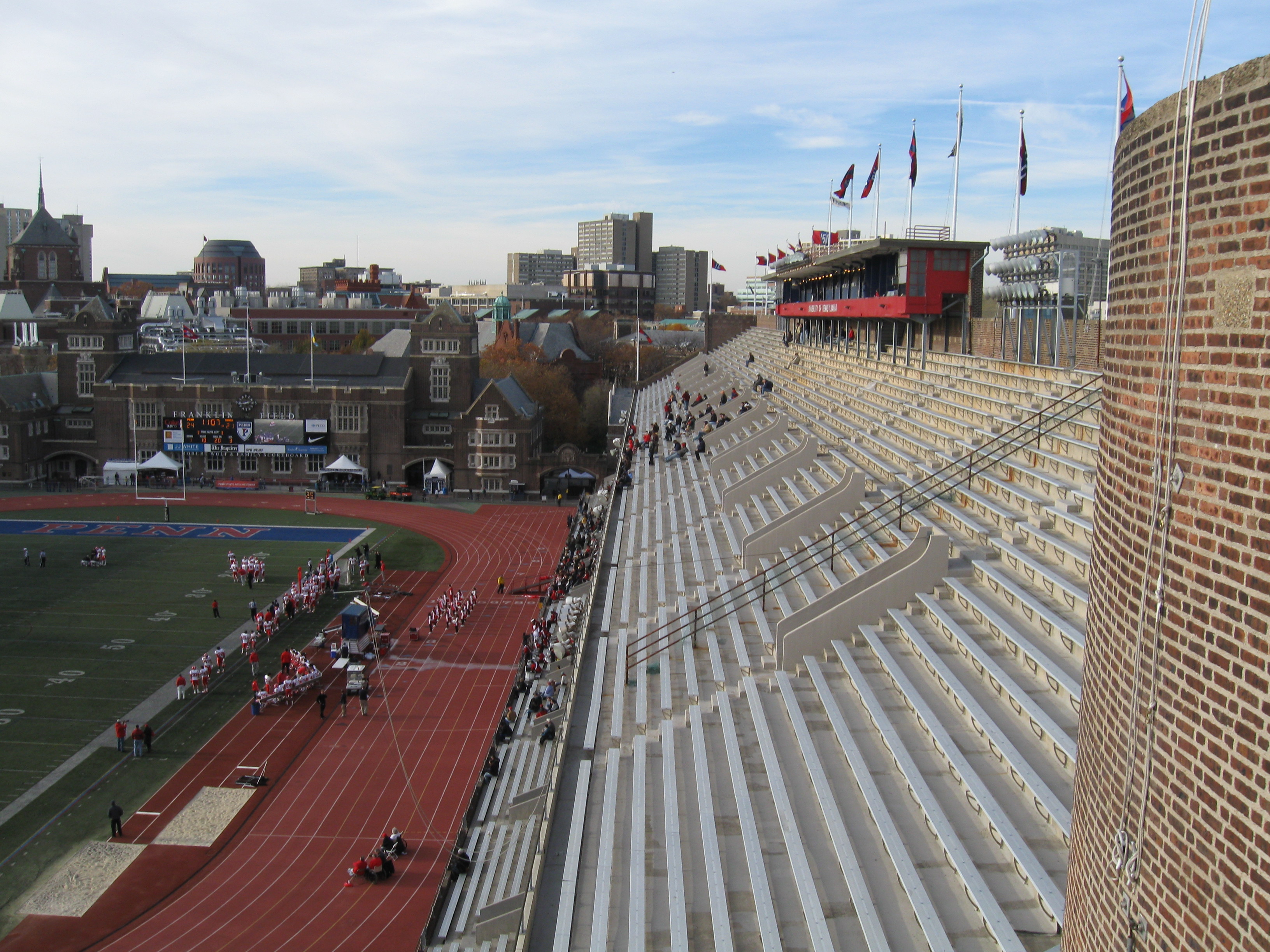Franklin Field is a double-decker, horseshoe stadium with both amazing and awful views. The horseshoe design features a curved section of seats in the East endzone, while on the open end is the old Weightman Hall building. All of the seating on the sidelines is flat and facing forward and the first level is unique in that more than half the seats are covered by the upper deck. The further back you go, the more enclosed it feels, especially with the second deck over your head and brick walls both behind you and on the sides at the end of the seating. The old feel is really noticed here, especially where support beams are in the way of the view. Even more obscure, are the stairs at the back of the first level. They aren’t even connected with a walkway, they are just in the middle of the aisle and act as the only means of bringing fans to the second deck. That second deck, offers a great overhead view of the action. What makes it even better up here are the incredible views. On the South side, fans have a terrific view of the Philadelphia skyline to the Northeast. Many seats in the upper deck have a great view of the University of Pennsylvania, when looking over Weightman Hall. The only drawback, is there is a disconnect with the lower level and when I was sitting up here, you could barely hear any noise created from the fans underneath in the first deck. All of the seating is set way back of the field because of the track. However, given the history of that track, I’m a little more tolerant (see Other Stuff). Nearly all of the seats are aluminum bleacher set in concrete, though there are some blue and red plastic seats near the center of the field on the Penn side. The pitch to each row is decent and the legroom doesn’t matter much since you can find open seating somewhere at a Penn game. On top of one of the sidelines is a small, one-level press box with “University of Pennsylvania” written across the bottom. You will find many old football stadiums in the NCAA, however you will be hard-pressed to find one as pure and untouched by renovation as this one and that uniqueness makes it special.