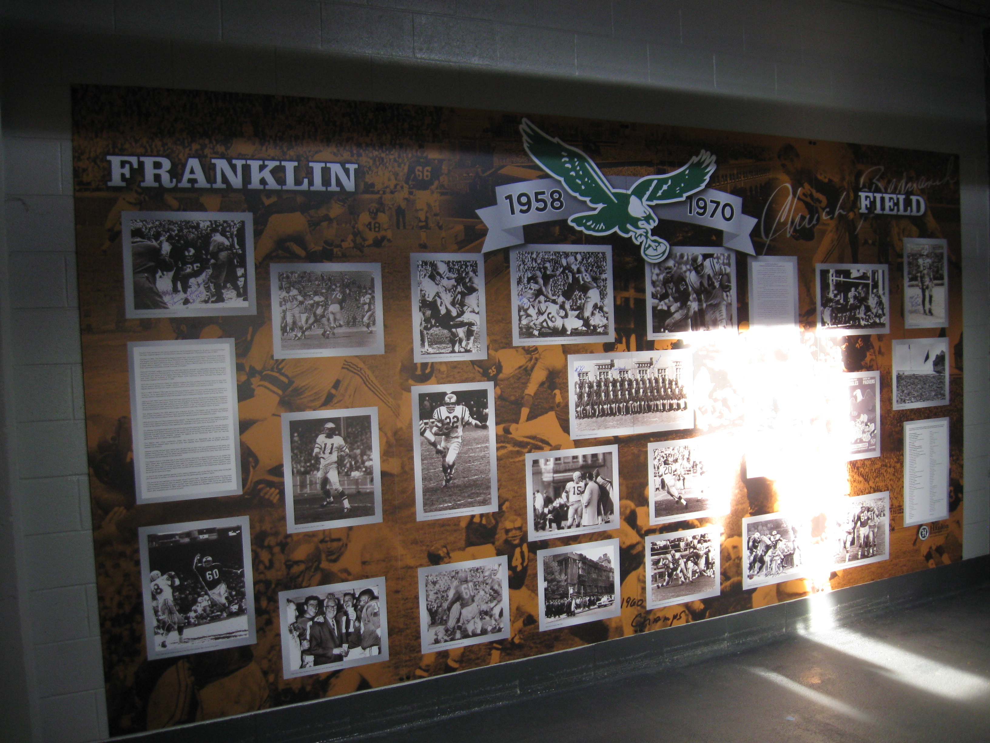 There are plenty of displays outside and inside of Franklin Field and it begins with the statue of whom the stadium is named after. THE Benjamin Franklin welcomes visitors upon the approach into the stadium. Several other plaques and statues can be found on the walls and ground, particularly in the open endzone. These honors really touch on the history at this place. Recently completed is a neat mural of the NFL Eagles’ years at Franklin Field. Penn’s Ivy League Titles can be found on the lower wall behind the visitor’s sideline. These are nicely done and complete with both Penn logo and the year. Also, there are many flags flying around the top of the stadium, however I couldn’t find what they were representing.