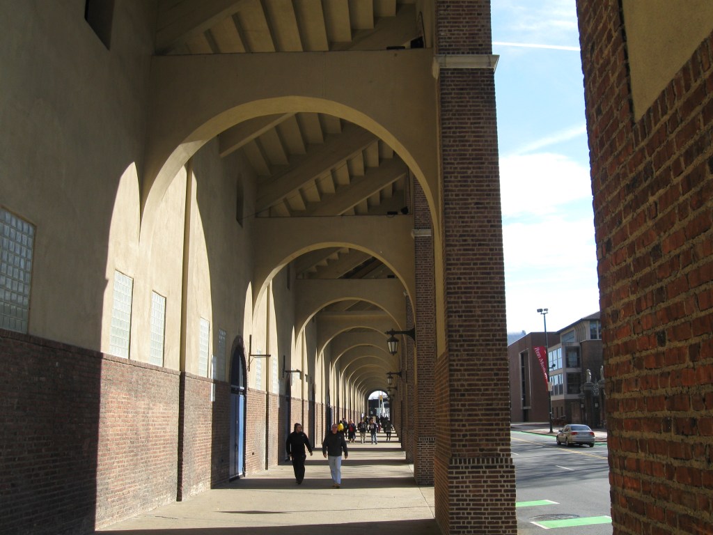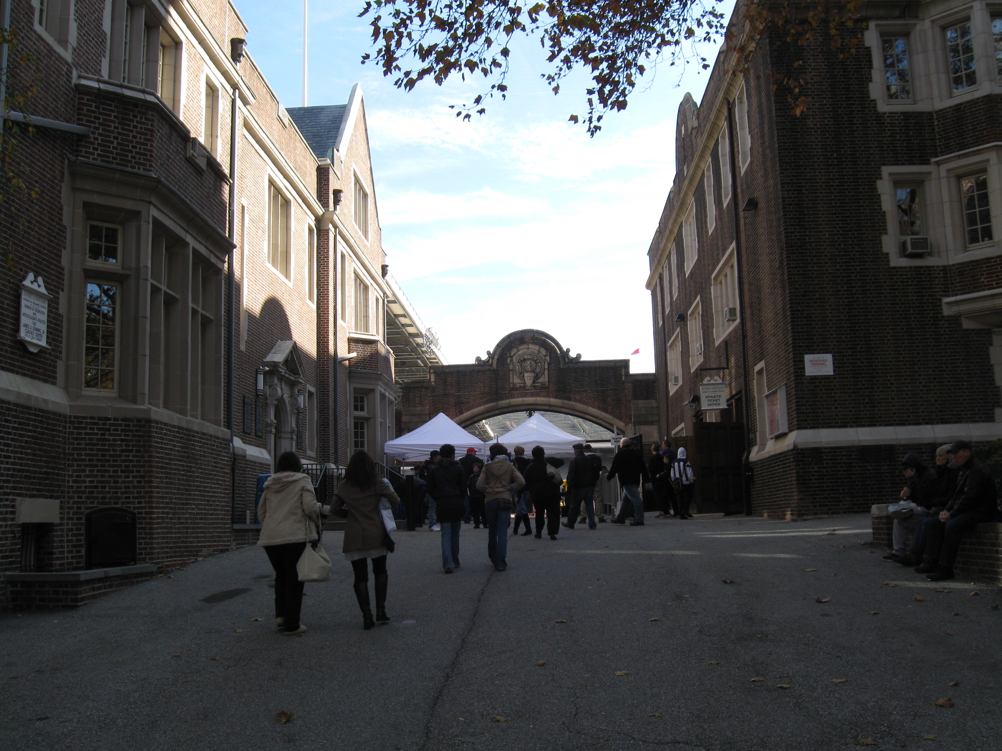 I was thrown off walking down the street towards the stadium as, like the Palestra next door, there’s not much to give away that it is a football stadium. The brick building features two tall, flat sides with archways. In fact, the stands on one side are over South St and a walk down the sidewalk involves going under the higher stands. What is deceptive with the stadium is that the main entrance is in between a couple buildings (Weightman Hall being one of them) and it doesn’t even look like an entrance. Fans go through the gates and there is a small ticket office in the building on the right. A school sign for Franklin Field sits on the outside, nearby a historical marker for the Penn Relays (see Displays). Overall, the exterior has a better aerial look (from Google) than one can appreciate since they it’s hard to get a distant view of the venue.