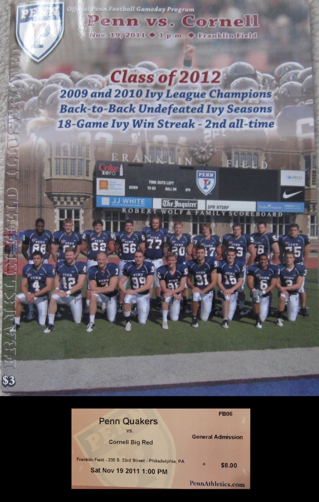 The game was terrific as it was an up and down affair with the teams trading touchdowns. It started great for Penn as Cornell fumbled the opening kickoff and the Quakers scored a touchdown a few minutes later. Cornell got the TD back and then after a few punts, the teams traded touchdowns until it was 21-21. A Penn field goal put them up by 3 at the half. The Big Red got the lead after Penn turned the ball over on downs and Jeff Mathews threw a 54-yard touchdown pass. A few possessions later, Mathews got nailed and Penn picked up the fumble deep in Cornell territory, scoring shortly thereafter for a 31-27 lead. Cornell quickly answered and so did Penn, leading to a 38-34 score in the middle of the 4th quarter. Cornell drove it deep on their next possession, but failed to convert in the red zone. However, as Penn got the ball back, Billy Ragone threw an interception and Cornell this time cashed in on the next possession to take a 41-38 lead. The Quakers followed with a great drive again, but their 44-yard field goal attempt to tie it with 5:23 left was blocked. Penn’s defense had no answer for the Cornell offense all day and they couldn’t get a stop when they needed it as the Big Red effortlessly drove down field, eating clock along the way before scoring a final touchdown. They won 48-38 in a crazy game. Cornell’s Jeff Mathews was 35 for 45 with 548 yards (an Ivy record), 5 TDs and 1 INT. The teams combined for 46 first downs. Meanwhile, Penn had 9 players catch a pass.