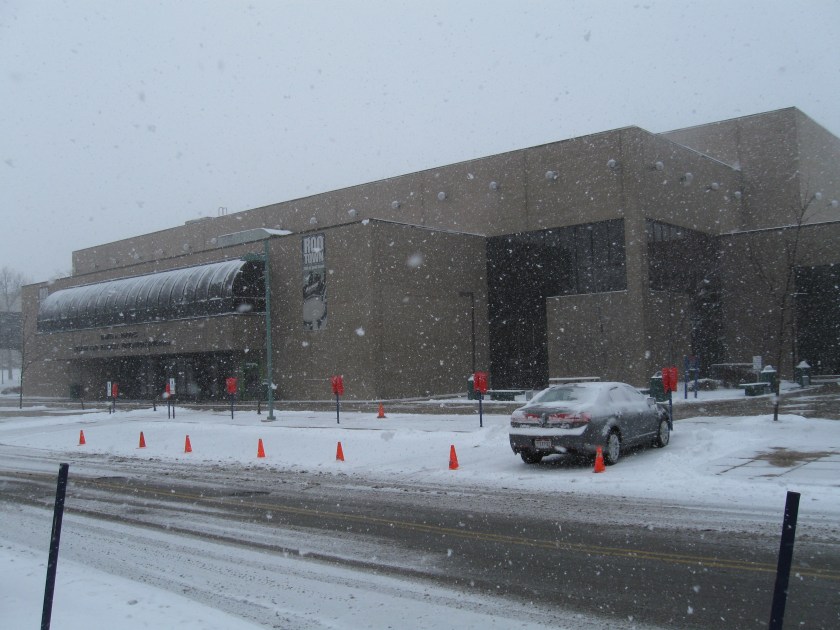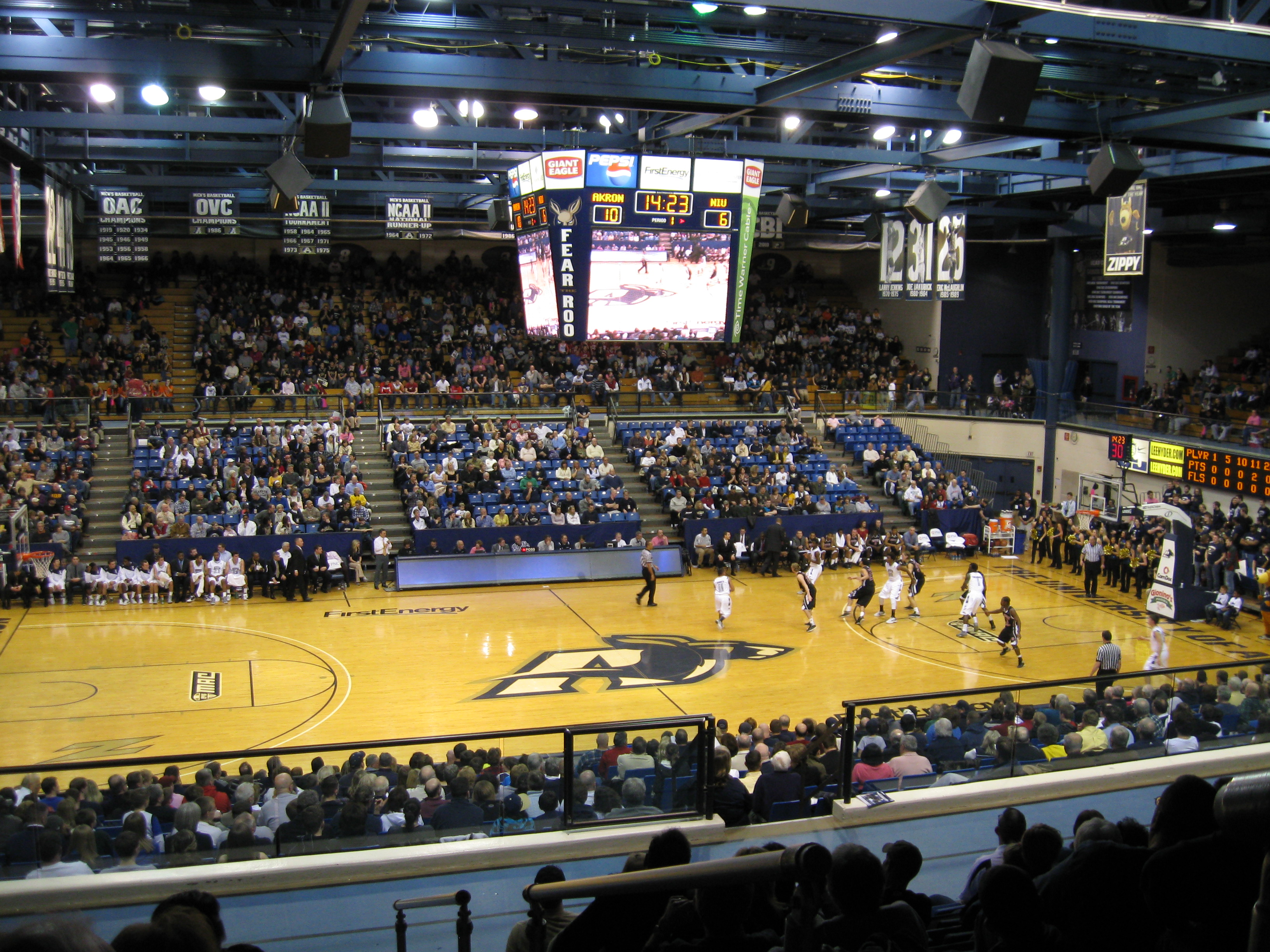 Weather continued to get in the way of my Ohio MAC doubleheader. After the morning game at Kent State, lake effect snow accumulated 5-7 inches making the usually short journey to Akron dicey as I-76 closed due to multiple accidents. So, I took side roads for a nerve-wracking trip that finally got me into Akron. This city of nearly 200,000 is located in Northeast Ohio and it used to be known as the “Rubber Capitol”. Most of the major tire companies set up shop in Akron, but now only Goodyear is left and the University at the center of the city has become the focal point. The school dominates much of downtown and one of the largest on-campus buildings is the Goodyear Polymer Center as Polymer research is what the school has specialized in. The Zips began competing in Division I basketball in 1980 and they made their first tournament in 1986 under Bob Huggins. After many lean years, Keith Dambrot turned the program into one of the MAC’s best as they have made five straight championship games (and been to two more NCAAs). James A. Rhodes Arena, better known as the JAR, opened in 1983. A decent atmosphere accompanies Zips games, but the facility itself seems a little outdated with seating arrangements quite far from the court.