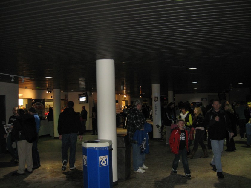 First, fans enter into an area in the lower portion of the building. Seeing “The ‘Roo” (team mascot) at the entrance is a nice touch, however this area is rather dark and it feels confined with a low ceiling. The main food stand is located down here, along with a small merchandise space. Fans then climb stairs up to the arena on either side of the concourse and this leads to the inside of the gym. Each “corner” entrance features a smaller food stand and some windows to the outside before you reach the interior. Thus, it’s a disjointed concourse experience with limited space.