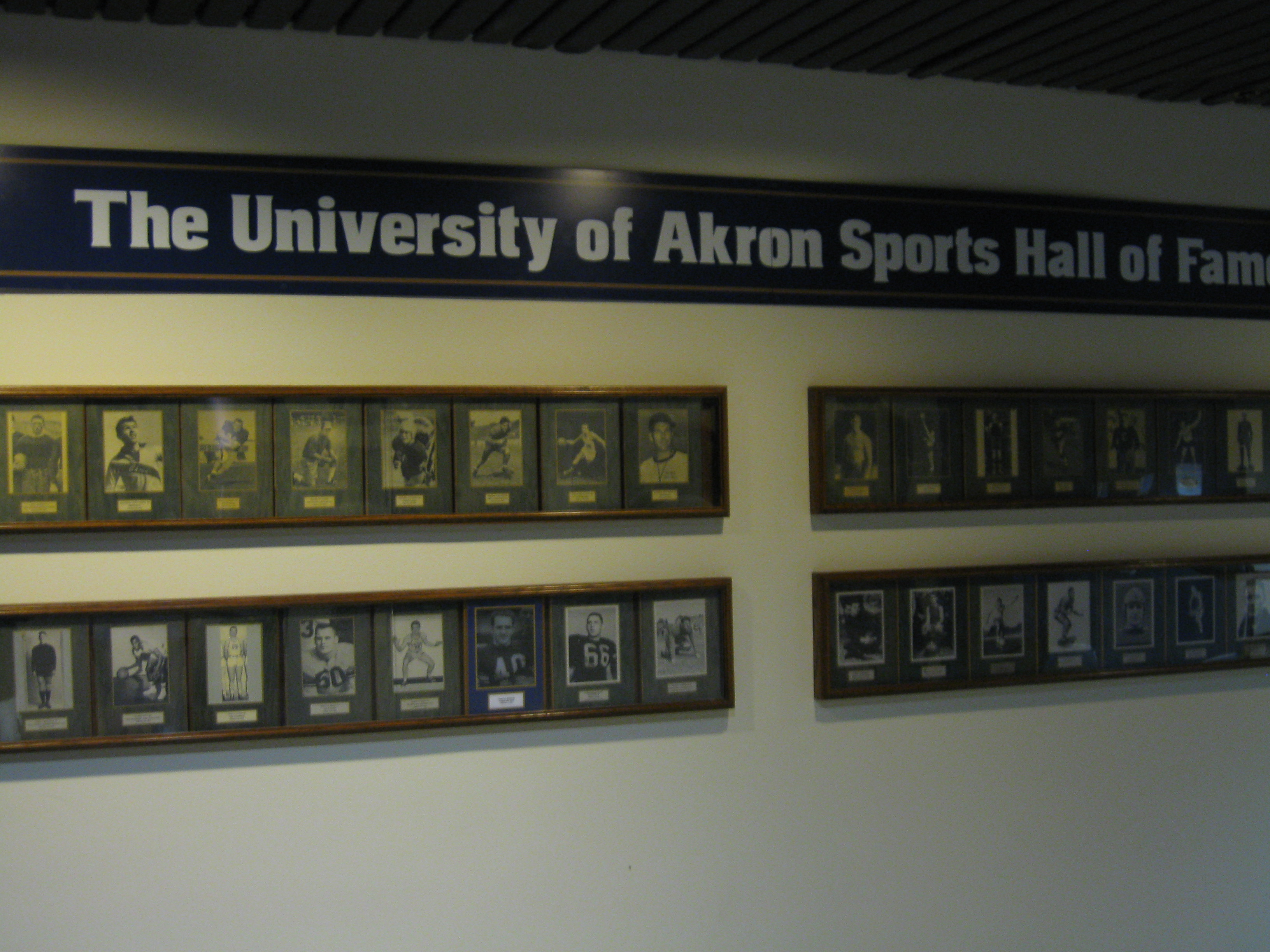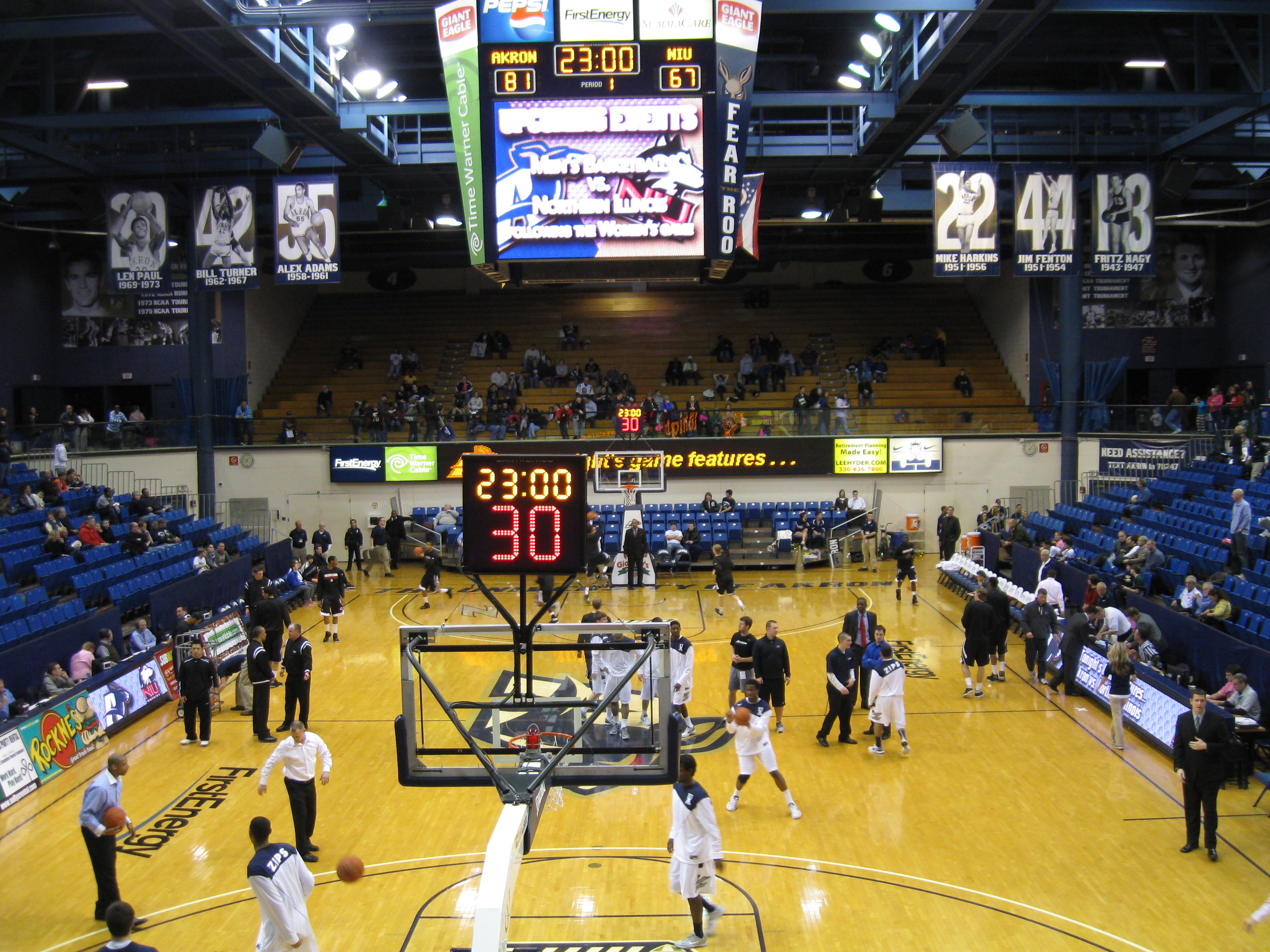 Down in the lower-level opening foyer is the University of Akron Sports Hall of Fame, with a nice, but very old collection of photographs each in a wooden frame on a wall. Expanding out to Summit County, the walls in the corners are filled with names recognizing members of the county’s own Sports Hall of Fame. Inside the gym, Akron does a real good job of honoring its past by having huge murals on the walls in each corner. These murals are for prior Zips coaches and they contain stats, achievements and old photos. It is interesting looking at a younger Bob Huggins on one of them. The rafters were full with 11 retired numbers (two from the Women’s team), along with banners for various conference and NCAA achievements across multiple sports.