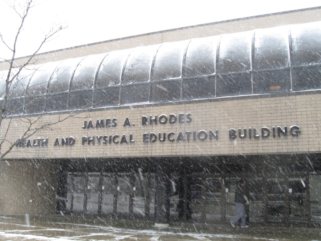 A drab, brown-brick building greets visitors as the facility looks more like a place for intramurals than a 5,500-seat arena. The only liveliness is the “Roo-town” poster on the front. Above the opening doors in black lettering is “James A. Rhodes Health and Physical Education Building”.