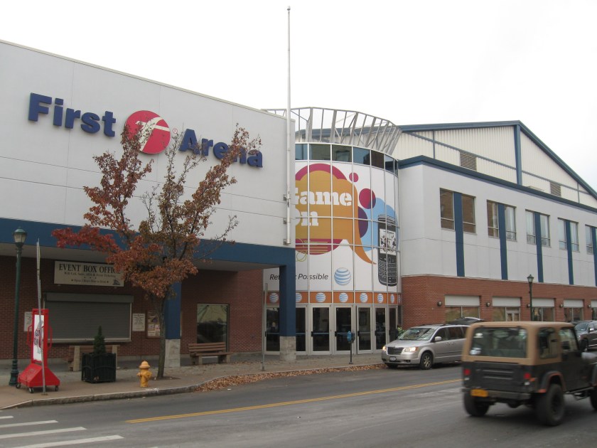 I was very surprised to find out that there is actually a second ice rink at the facility. Attached at end of the building on the College Street side is an ice sheet used mostly for area recreational activities…..Coach USA is indeed the bus-service company and they had naming rights to the arena for a little while. Ironically, the new rights holder, is also a transit company…..The development of the arena was controversial in that several businesses were evicted and forced to relocate to make room for the new facility.