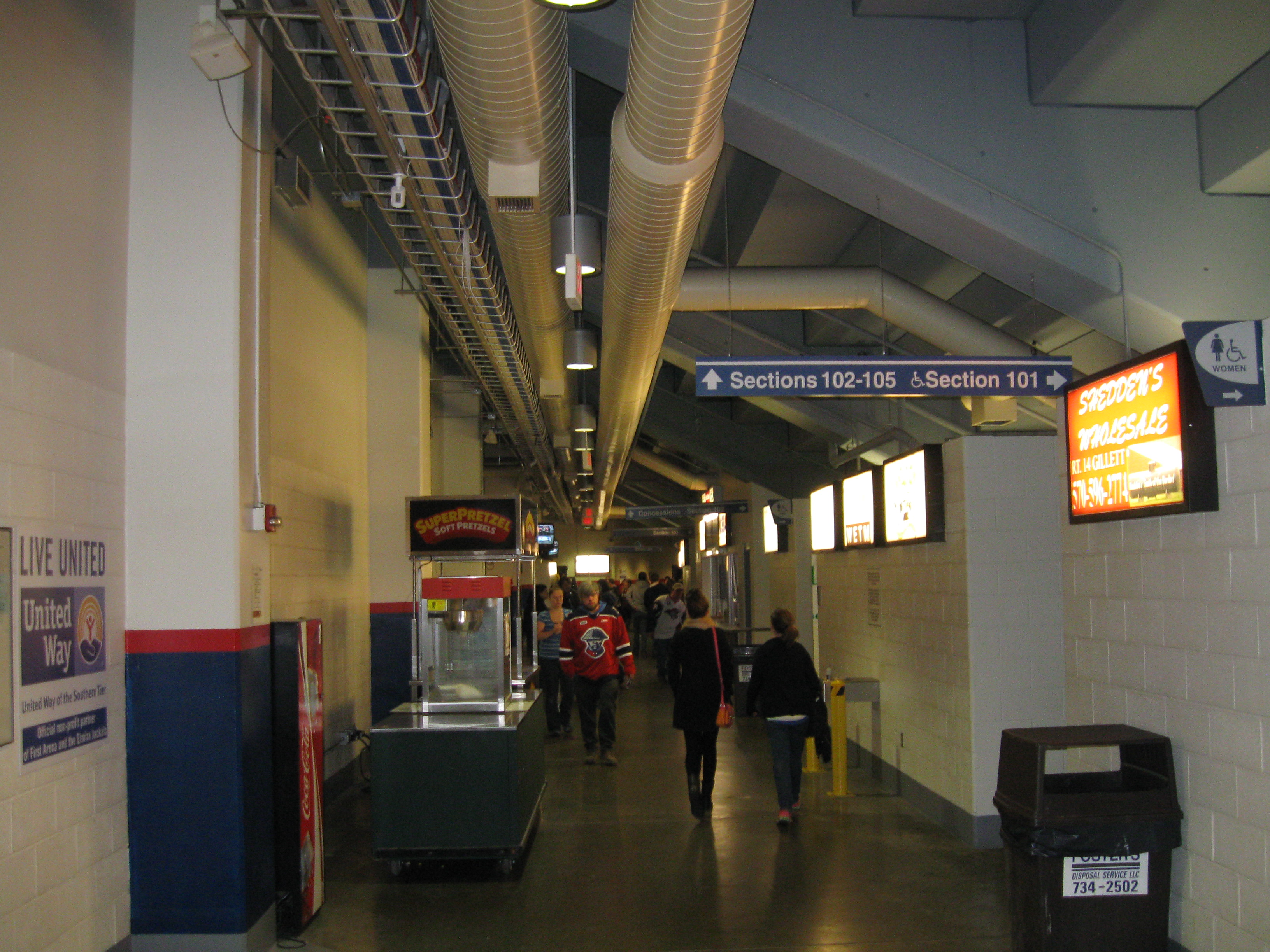 The concourse considered narrow, is to be expected for a building this size. It doesn’t go around the entire arena and that forced U-turn leads to congestion in between periods, along with an annoyance for getting to a corner section. There are also signs of cheapness around, including the bathrooms (where one of them was out of hand soap). Light purple and white walls were mostly bare for my first visit and then became more ad-filled the second go around. A small separate room contains a merchandise shop. Windows at street-level and in-house TVs help liven up the concourse a bit. An unexpected surprise however was the sports bar accessible from both the concourse and outside the building that includes a restaurant. In 2014, they added some pre-game music to this area, enticing fans to come hangout before the game. The restaurant on the second-level includes a view of the game.
