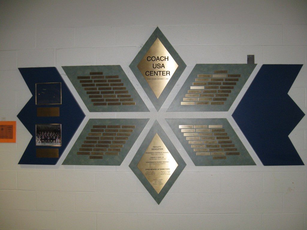 The only thing in the concourse is a plaque board to honor those that got the facility up and running. It’s nice if you are or know that person, but let’s be honest…who really cares. Inside, the end wall siding has a fair share of ads, but there are also banners underneath the scoreboard. These for Eastern Conference Championships in the UHL. The other one is the #26 of former player Eddie Lowe.