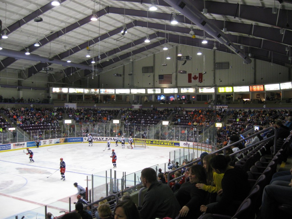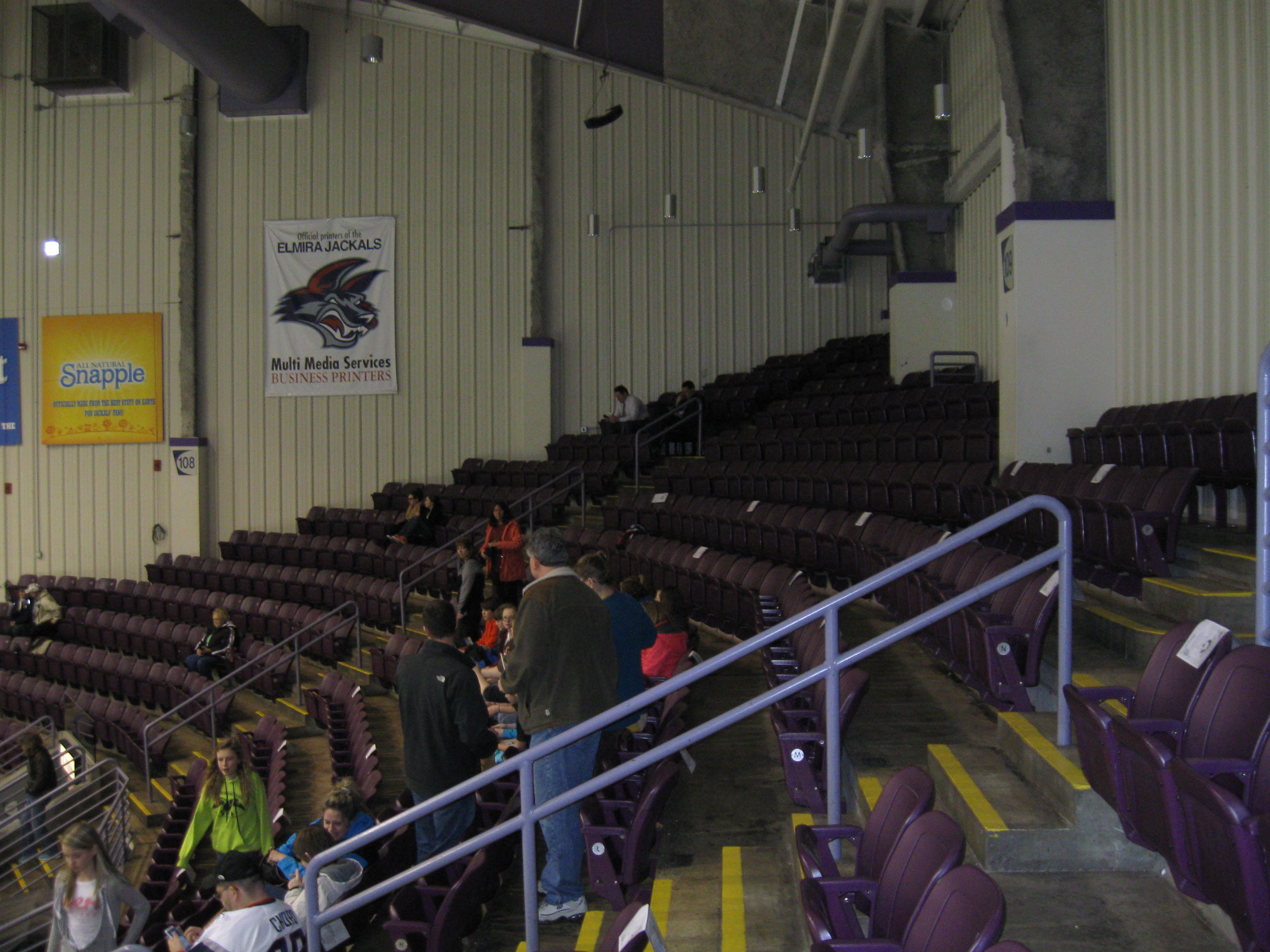 Nestled in a valley amongst rolling hills, the small city of Elmira is located in the Southern Tier region of New York. The city has a population of just 30,000 and is also a former home of Mark Twain, where visitors can check out various Twain things around the area. For my first visit, Elmira was in their third season of pro hockey, having competed in the UHL. Success on and off the ice led to a bump up in level to the ECHL in 2007. They’ve made it to the playoffs each season, but have yet to get past the second round. Elmira’s downtown facility opened in the year 2000 and while the $16 million facility is on the small side, the new addition seems to fit this area quite well. There have been tumultuous times though with the city and owners as the whole pro hockey venture seems to be on thin ice in this community.