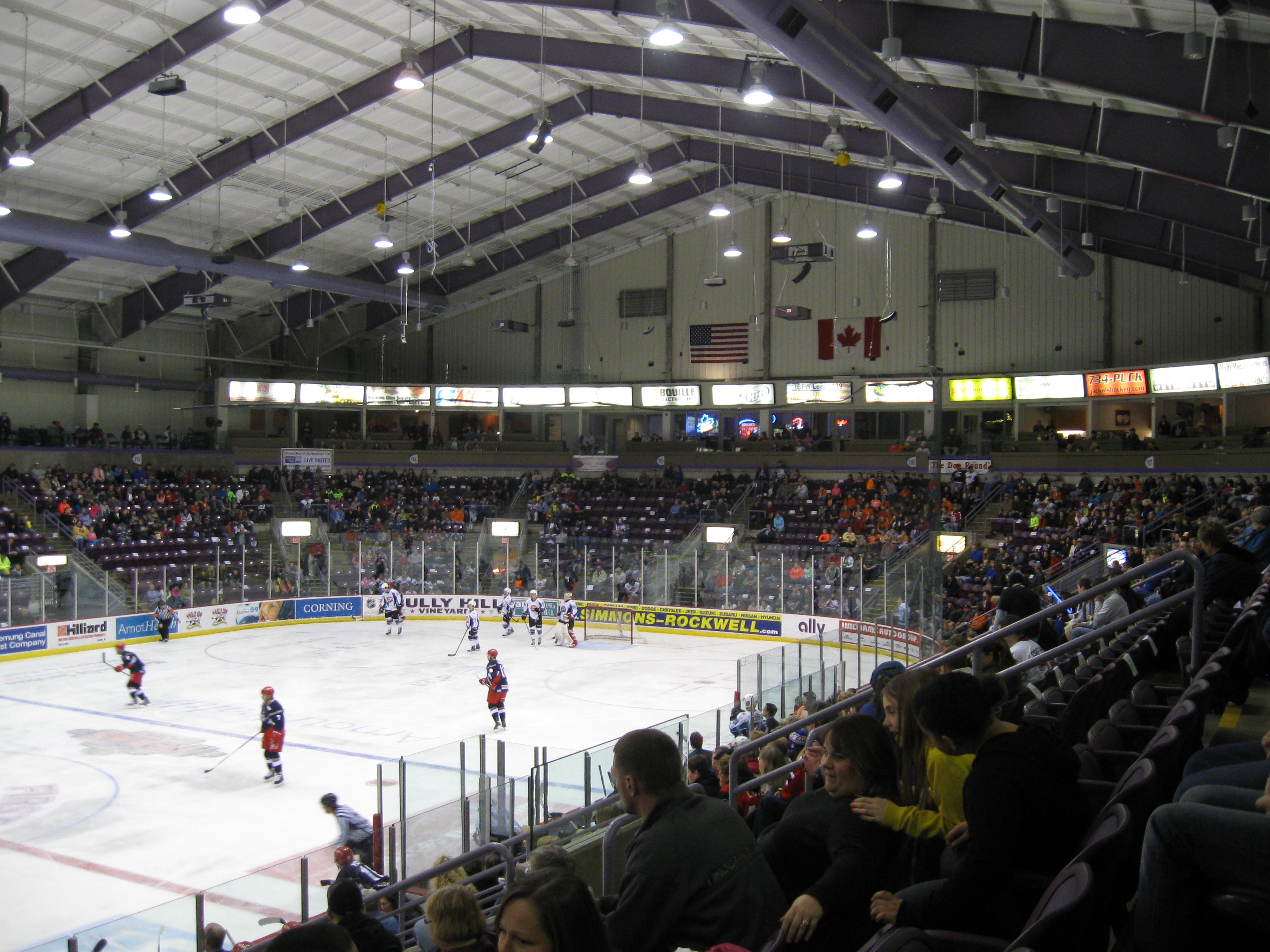Elmira feels much more like a big town as opposed to a city and that is most evident when driving to the center of it. Coach USA Center is right in the tiny downtown core, which is close to the Chemung River. Elmira certainly is not bustling and is even a little downtrodden. Places to eat around the arena were sparse, but M&M Hot Dogs and its famous meat sauce, is a few blocks down.