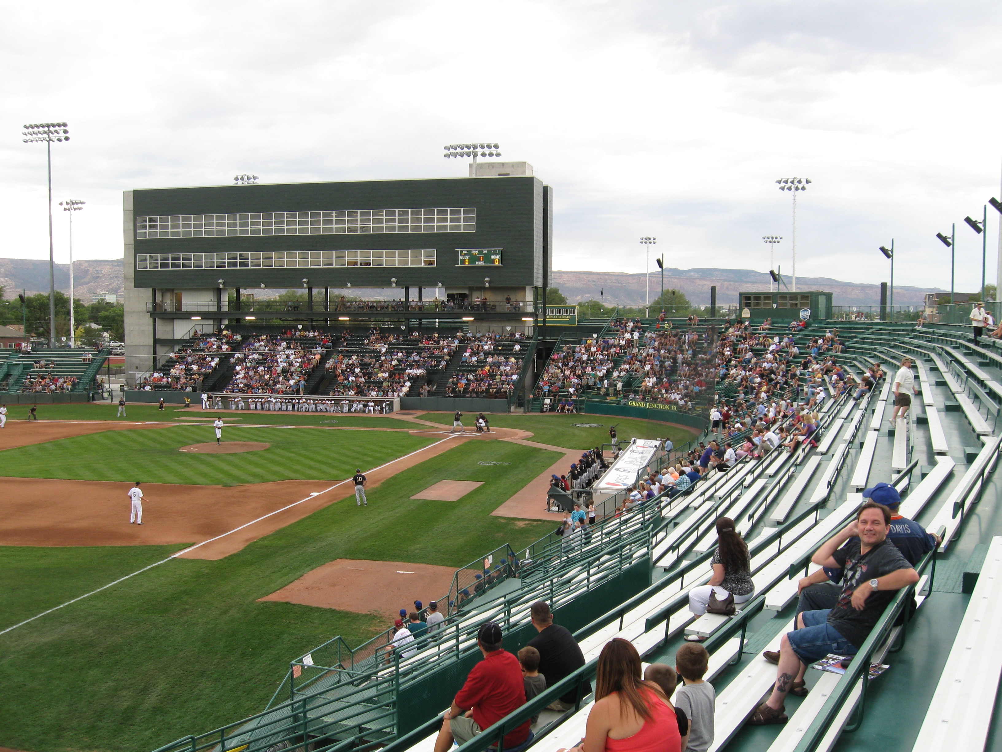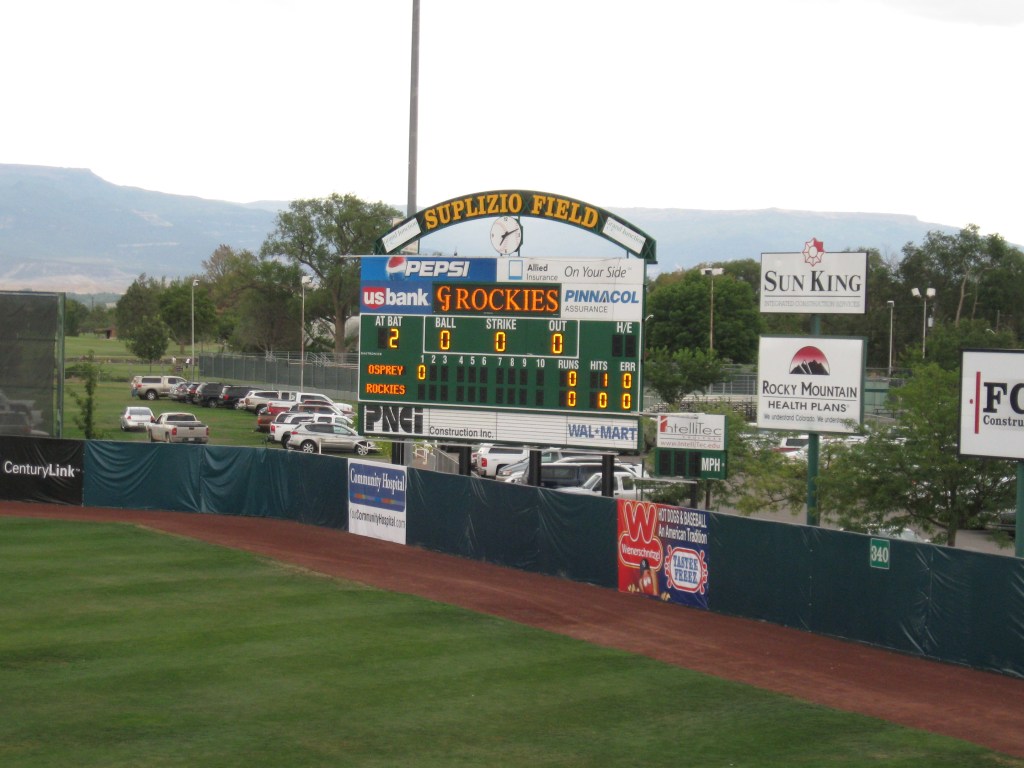 Grand Junction is a baseball town. As successful hosts of the locally popular JUCO World Series for 53 years, the city received its own professional franchise this season (2012) in the form of the rookie level, Pioneer League. Colorado Rockies ownership bought the franchise in Casper and moved them to Grand Junction, which is in the western edge of the state. This “city” of 58,000 has a town feel to it with a very charming Main Street. The valley region is known for its varied crop production and wineries, along with its gorgeous high desert scenery. We focused on that and spent our afternoon atop the Colorado National Monument, a drive full of amazing views of the canyons and mesas. The Rockies game was on a hot, but pleasant summer evening at Sam Suplizio Field, a stadium that has been a mainstay in the area since 1949. The subject of countless tweaks, the last renovation over the past year was more significant to get it ready for the Rockies. Suplizio makes for a unique and interesting setting for baseball.