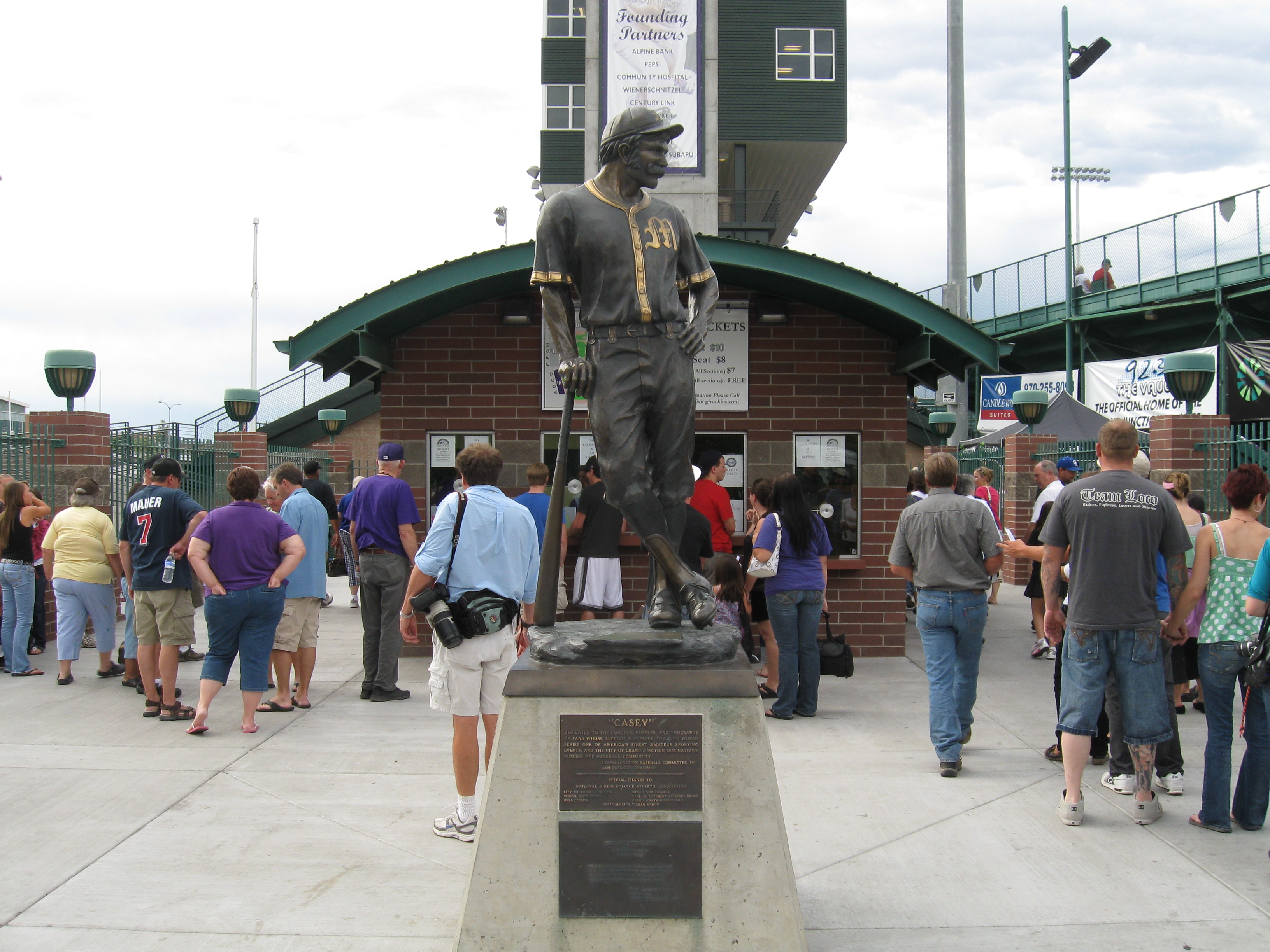 There’s a great statue right in the middle of the front entrance called “Casey”. It is dedicated to all those involved with the JUCO World Series. Also at the front entrance, is a plaque for Sam Suplizio, whom the ballpark is named after. He was an all around baseball man who contributed greatly to the entire baseball scene in Grand Junction. Since this is a new team, I didn’t expect to see any banners, but it was still nice to see some Rockies banners in the concourse saying “Play Ball”. The last display I saw was inside on the top of the outfield bleachers, where large baseballs displayed a name, though I’m not quite sure what those names are for.