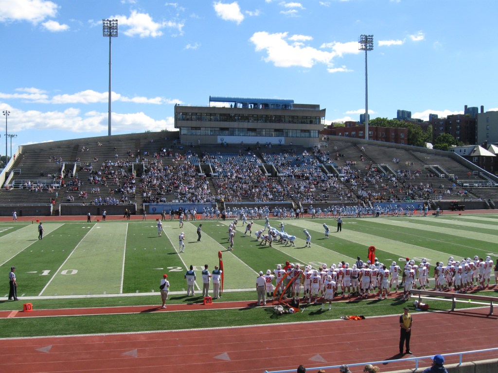 Most of the seats are on the south side and it consists of a large section set in concrete that extends the length of the sideline. Seats are mostly bleachers and they go up for a ways before a slight arc occurs at the top. This is also where a two-level box is located, housing media and an alumni lounge. A sign on the bottom wall displays the name of the stadium. Towards the middle of the stadium, there are a good amount of light blue seats with chair backs, while higher up are molded seats, but with no backs. The other side of the stadium features a visitor’s sideline, where a much smaller set of metal bleachers are located. These are worn and weathered, plus they can get quite hot on a September day with the sun out. End zones are open. A downfall is the track that circles the stadium as that leads to both sides needing the seats further from the field. What makes Wien Stadium stand out is the neat view, especially from the top of the main seating bowl. Sitting in New York City, you would not expect a canopy of trees, but to the left is a peaceful view of Inwood Hill Park. Straight ahead is the Hudson River spilling into the Harlem River, along with the Henry Hudson Bridge, then to the right are those towering apartment buildings that are so familiar with the city. It’s a nice setting for football.