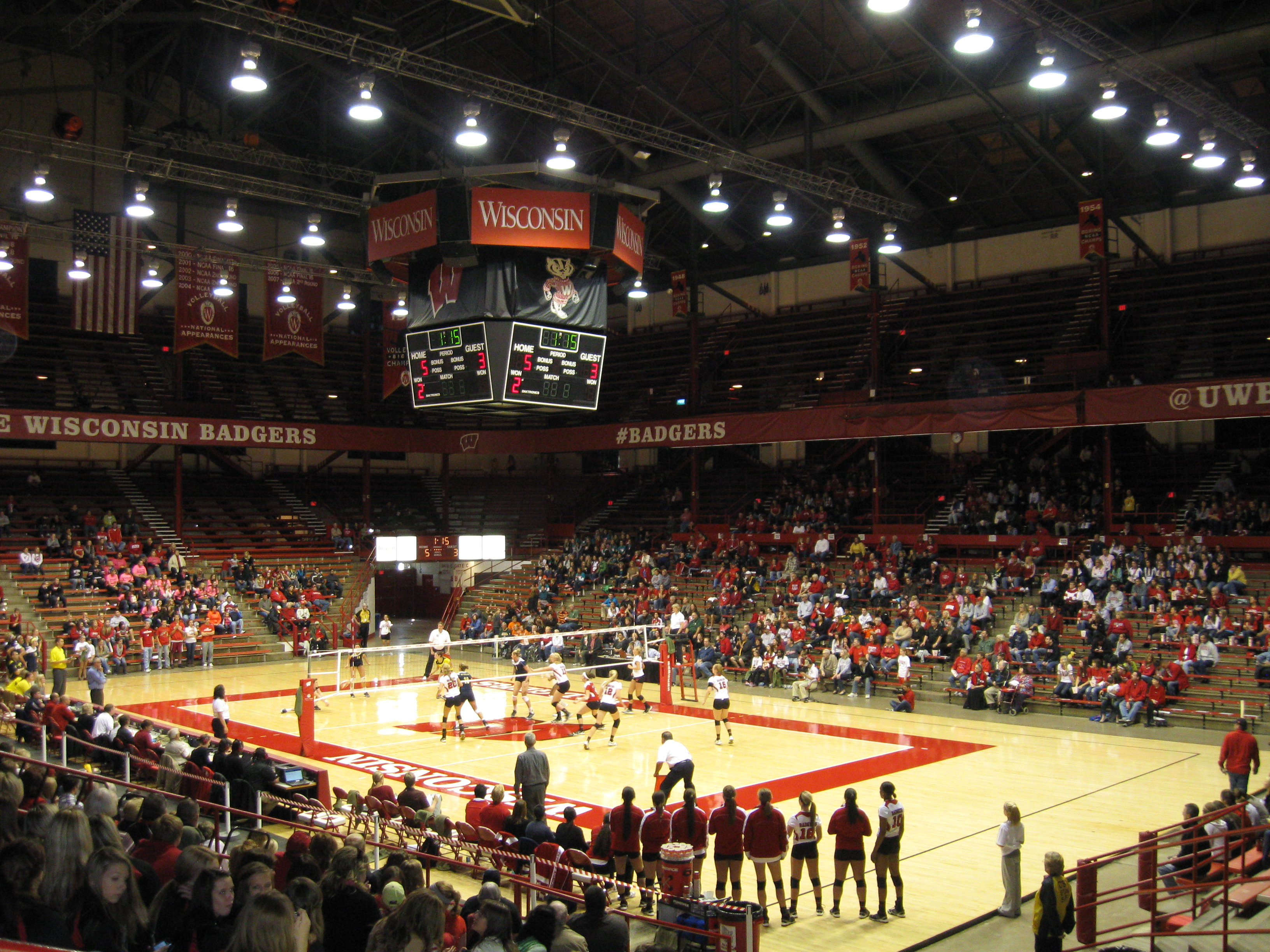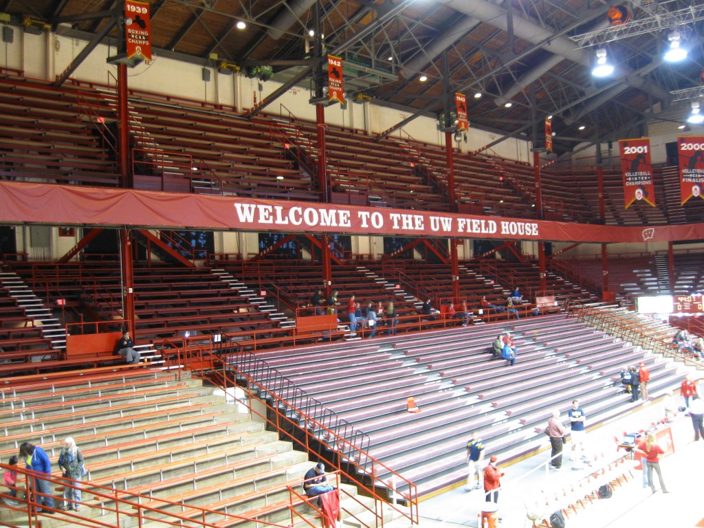 My weekend in Madison continued as I headed back to the University of Wisconsin for a mid-season conference game at the second volleyball venue that I have ever attended. UW is a public school known for its high research activity and is considered a very good university. Over 40,000 students attend and there are a staggering 130 majors. The huge, sprawling campus is right in downtown Madison, which is the capital of Wisconsin and located in the south-central part of the state. It is a unique, mid-sized city as the center is on an isthmus, a narrow strip of land between Lakes Mendota and Monona. The region is crazy for the Badgers, as evidenced by the high attendance in all sports. Volleyball can be included in that and fans have had a lot to cheer as the team has done well since debuting in 1974. Four Big Ten Titles in a tough conference is decent, along with 16 NCAA tournament appearances, which included one runner-up finish. After basketball left for the Kohl Center in 1998, the women’s volleyball team became the main tenants of the UW Field House, an amazingly old-school building from 1930 that gives fans an excellent example of an early 20th century arena.