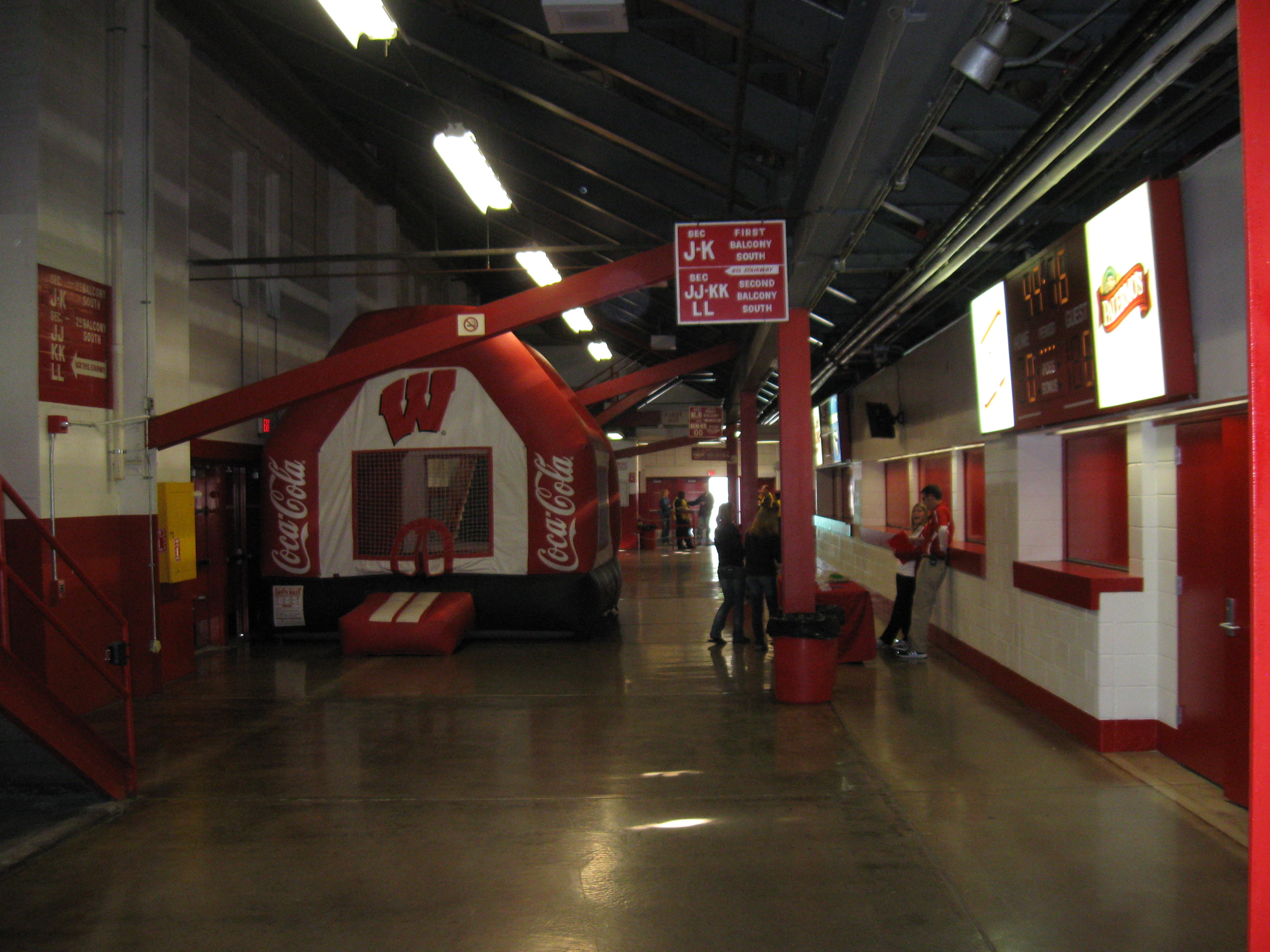 The square concourse is full of the school color red and has many support beams, not something you see nowadays in modern arenas. Stairs on the outside actually lead to the first level of seating, with the second level being accessed only from inside the arena. One can imagine the chaos of 10,000 people accessing varying sets of stairs after the game. Ability to maneuver the concourse space is eh at best. Despite space/access issues, the intangibles are really good including team displays and I love the old-style signs pointing fans to the seating. Additional features include Bucky’s Locker Room (a small team store), a kid’s trampoline and a few TVs, which were used to show the Packers game.