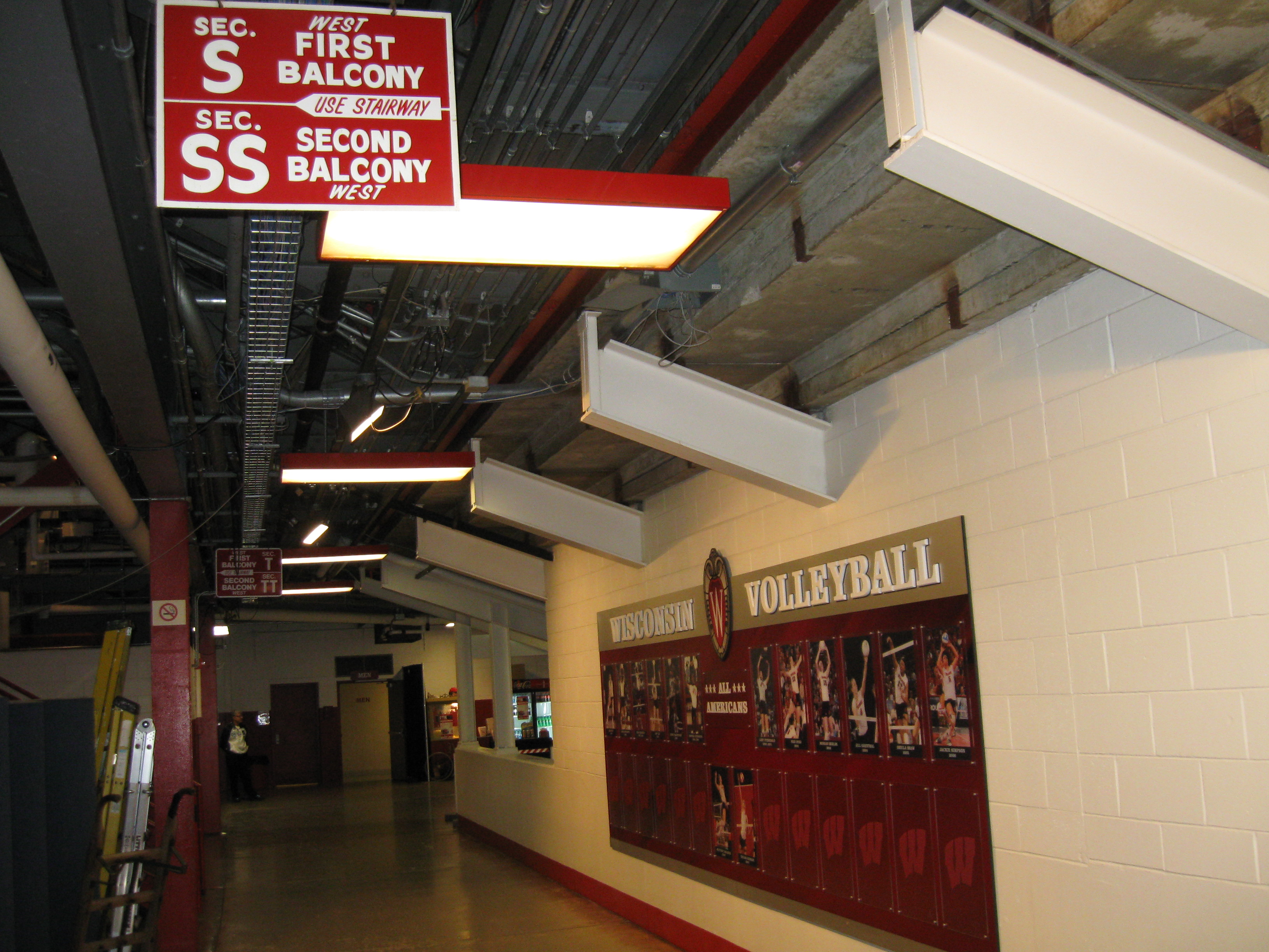 UW Field House is listed on the National Register of Historical Places and right near Gate D is a plaque. There is also an informational plaque on the other side of the entrance that describes the historical venue quite well. Inside, the concourse walls have a nice series of displays dedicated to volleyball. The best one is a picture of each All-American. Other displays include a team picture and a plaque of team captains. Other sports are honored too with a UW Boxing Hall of Fame and a huge statue for basketball coach Dr. Walter Meanwell. Hanging from the rafters are several large, red banners that display Badgers volleyball success. They are informative too as the banners for NCAA appearances display the year and how far the team got. I also like seeing the separate displays for each Big Ten Championship. Wrestling and old NCAA boxing championships are featured as well. Giving the Field House more character are the red signs on the bottom wall of the upper balcony. “Welcome to the UW Field House” and “Home of the Wisconsin Badgers” are an enhancing little touch.