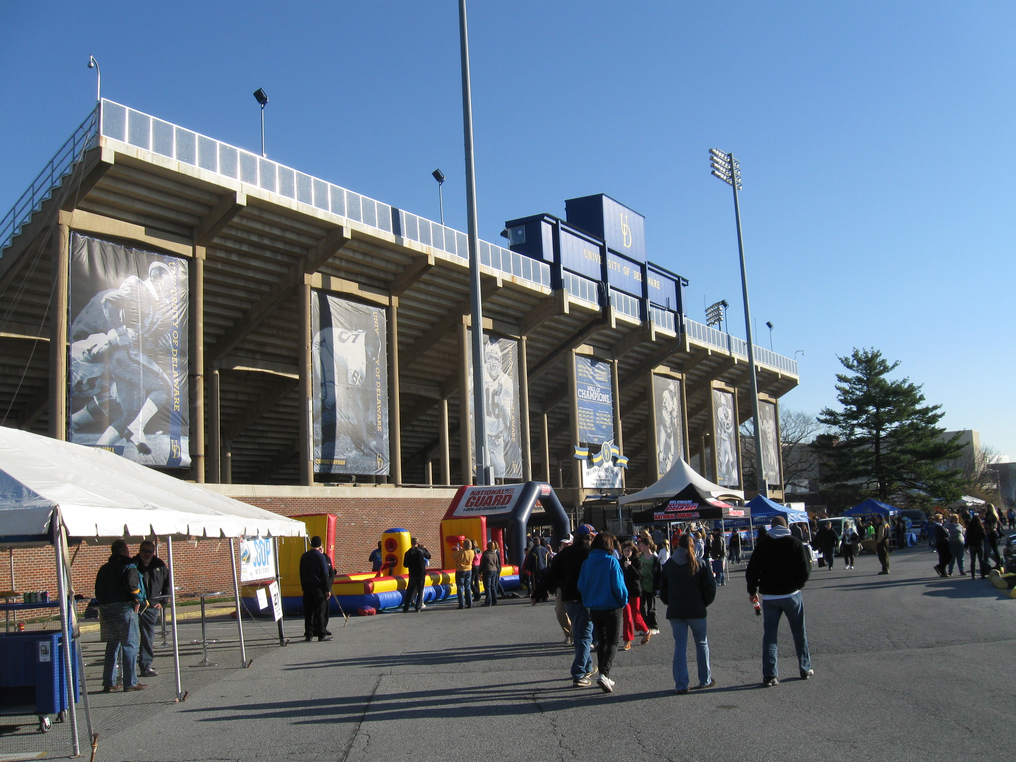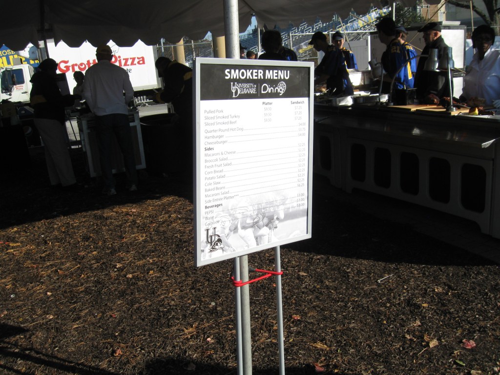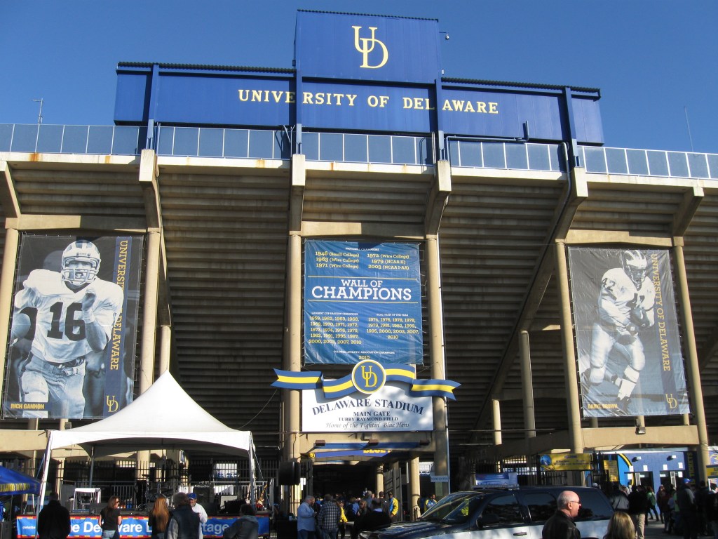 Delaware’s athletic teams are known as the Blue Hens, which is the state bird. There are also many references to the football team being called the “Fightin’ Blue Hens”…..The full name of the football stadium is Tubby Raymond Field at Delaware Stadium. The field was named after the head coach in 2002, following his retirement the previous season…..Delaware is one of the few teams to sport the Michigan-style winged helmets. This was started in the 60s, when the Blue Hens made the Wing-T offense a trademark…..The game I attended was against Villanova, a rival just 45 minutes away in Pennsylvania. The game is known as the Battle of the Blue and it is typically reserved for the last game of the year. A secondary rival has emerged in recent years and rightfully so as Delaware State has finally started to appear on the schedule…..Fans are allowed to bring in one bottle of water to the stadium, thank you for that…..Towards the end of the game, I started to get a whiff of something funky. Turned out to be horse manure as the University Farmhouse is not too far away to the North…..Tailgating was displayed throughout all of the parking lots as mostly alumni enjoyed some quiet get-togethers with food and drink.