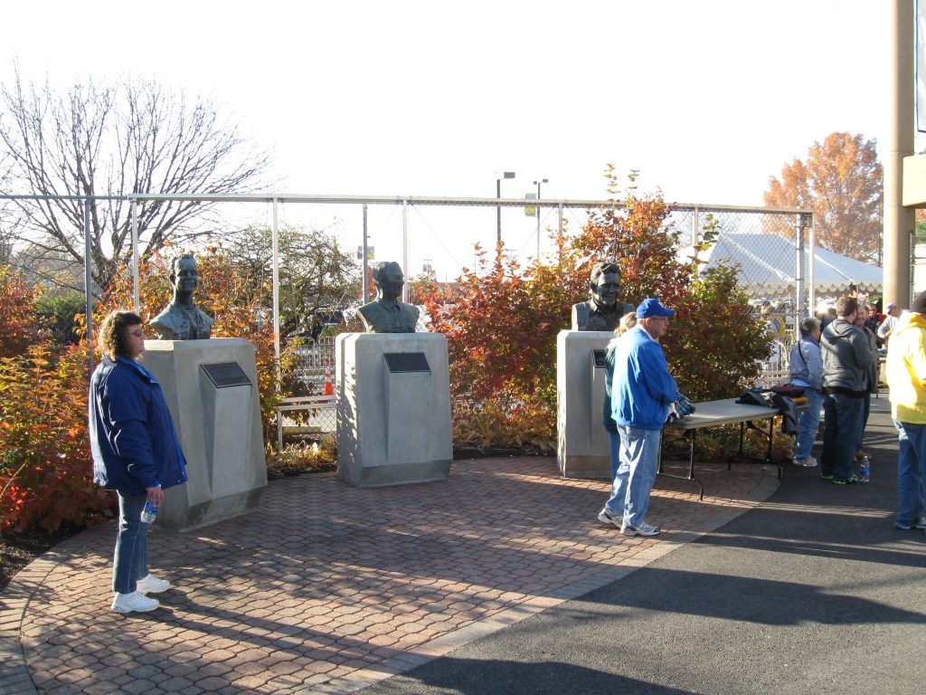I love the aforementioned Wall of Champions banner that immediately lets those entering know that this is a successful team. That banner features a listing of each year that the team has won a National Championship, Conference Championship and Lambert Cup (presented annually by vote to the best team in the Northeast). Also on the outside, is a blue wall next to the ticket window that displays Delaware’s All-Americans. The Blue Hens have quite a pedigree with coaches as three successive head men went into the College Football Hall of Fame. In a corner outside are the busts of these three coaches, along with a plaque describing records and honors. Inside, Delaware proudly displays its six national championship years by putting them on a blue banner complete with logos on the bottom of the sideline seating wall.