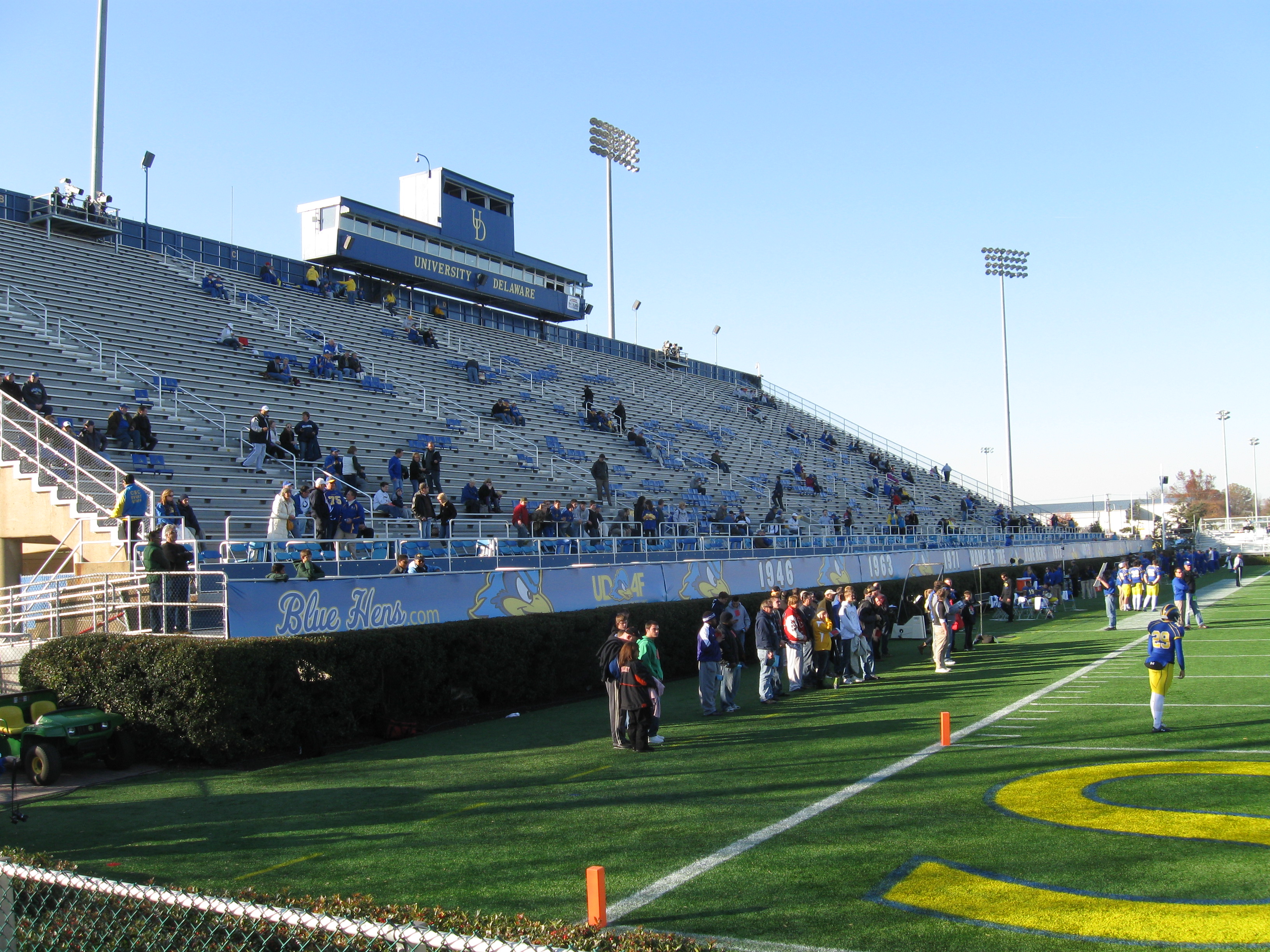 There’s not much to talk about inside Delaware Stadium as the set-up is quite plain. Sideline seating consists of bleachers set in concrete and it is quite a hike to get from the bottom entrances to the top of the stands (my calves were burning by the time I got to Row PP). These stands extend out to each goal-line. Just in front of the first bleachers is a poor excuse for “box seats” as these sectioned off areas are a group of blue, plastic seats with backs. On top of the bowl is a pair of press boxes, with the main one on the West side as that is blue with a yellow “University of Delaware” and UD logo. For those annoyed by sun glare, sit on the West side as the other sideline seats have a persistent sun in the eyes for the few hours prior to sunset. End zone seating consists of very small metal bleachers, while the corners of the stadium are open. It is nice that the stands are rather close to the field and that hedges separate the sideline and beginning of the seating bowl. Also, sightlines are good with the angle of each row at a decent level. The open corners and short end zone stands allow for a view beyond the field, which features other athletic facilities and practice fields. Though UD Stadium certainly has size covered for the capacity crowds, the stadium isn’t much of a highlight.