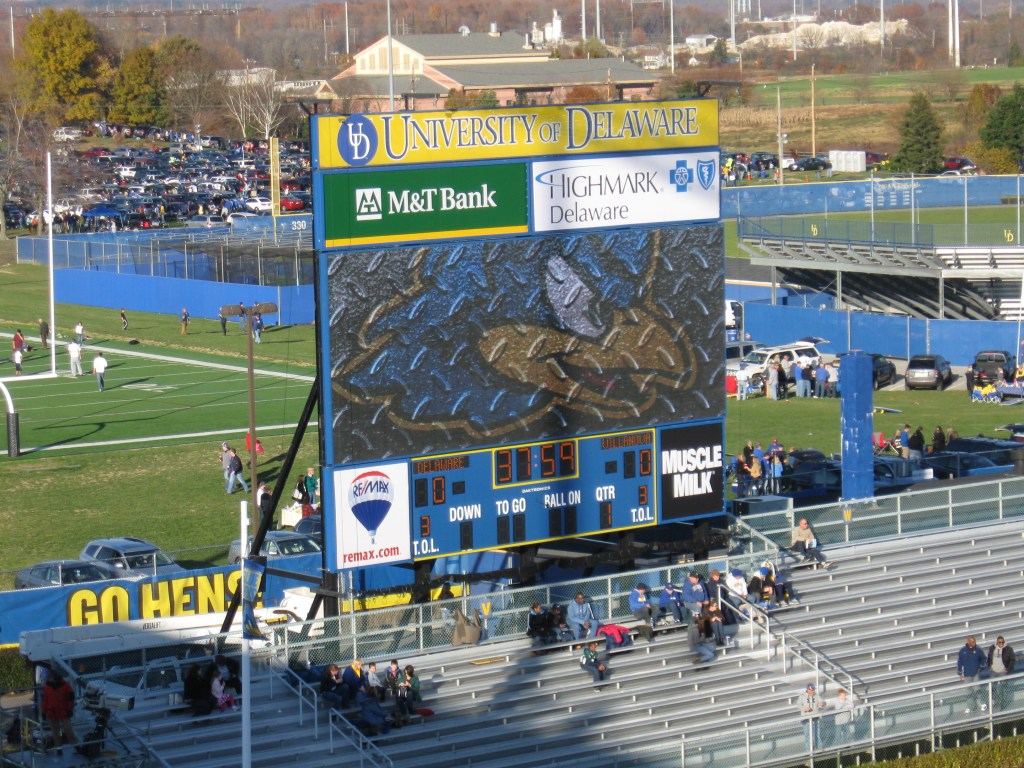 The fan support for Delaware Blue Hens football is undeniable as both attendance and reputation show. From 1999-2010, Delaware averaged 20,000 or more, a feat that stands alone in FCS. The last few years, the Blue Hens have ranked between #3 and #7 in the rankings as crowds have slipped with no sellouts. I was still impressed to see a full crowd dressed in blue and yellow for the last game of the year with a mediocre team as the only open spaces were in the upper corners and the ends. Student turnout however, was disappointing as that section was barely filled. Delaware football is the most popular team in a state not particularly known for sports.