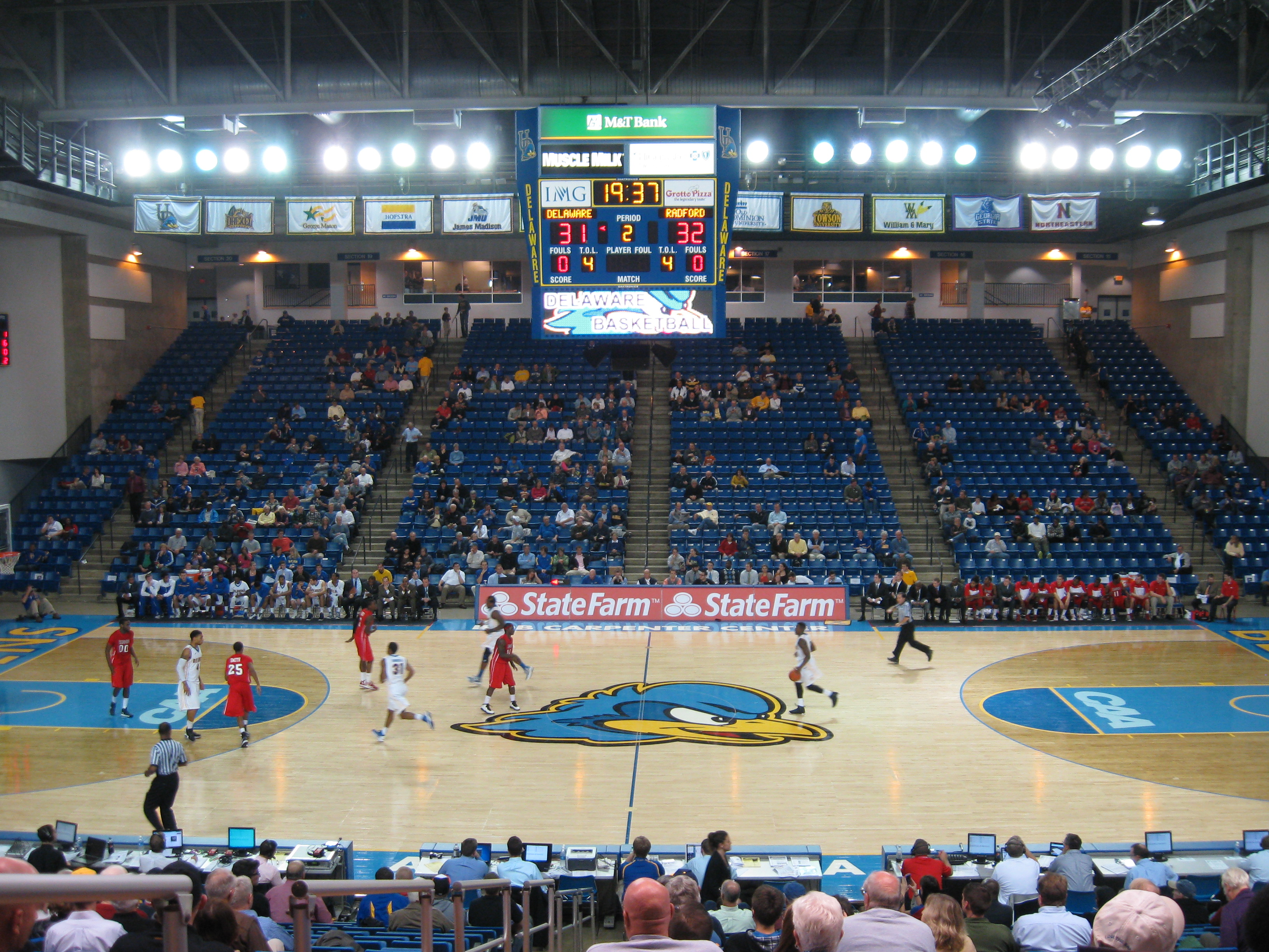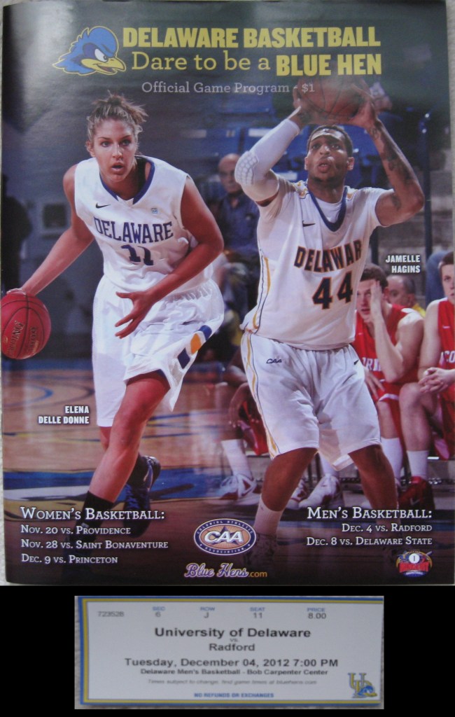 A beautiful early December day worked out nicely with plans to check out the attractions in the nearby Brandywine Valley before making the trip back to Newark for some Delaware basketball. Unfortunately, an accident on I-95 led to a huge traffic jam that delayed our arrival by well over an hour and I was only able to see the second half of the game. The University of Delaware takes up much of Newark (pronounced New-ark, as opposed to New Jersey’s New-erk), a college town of about 31,000 in the northwest part of the state. UD is a public ivy with a high academic standard that includes strong chemistry, engineering and pharmaceutical programs. Football certainly takes center stage athletically at the school, while basketball is trying to return to the glory days of the 1990s, when the Blue Hens made four appearances in the NCAA Tournament. In 1992, the Bob Carpenter Center opened up and the facility has a modern look, with a bright interior. Despite my short visit time, I saw everything the arena has to offer and enjoyed the set-up for Blue Hens basketball.