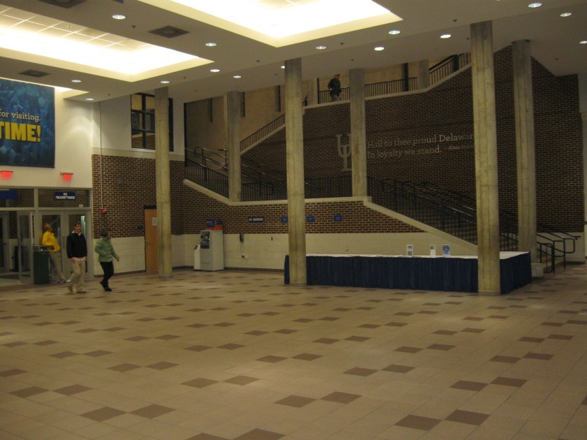 The partial brick theme continues inside the entranceway as walls are either brick or a plain white. It’s a really nice entrance into the arena as the large, open space features various displays and the walls have quotes from the Delaware fight song. A couple flights of stairs lead to the actual concourse which surrounds the top level of the arena. It is a little more plain up here, with the exception of the awesome Blue Hen logo on the floor as you make it to the top. The concourse has enough room most of the way and there are views of the court in all areas but the corners. Another nice touch is the tables and chairs set up at the ends, which make for a spot to eat before the game or during halftime.