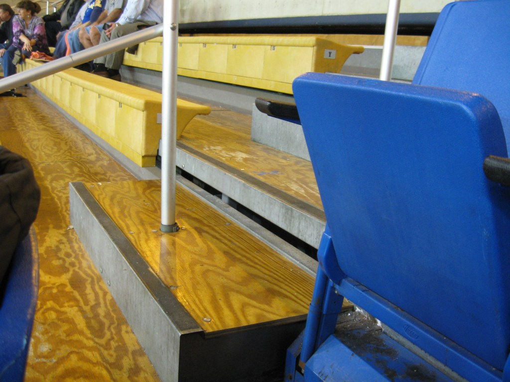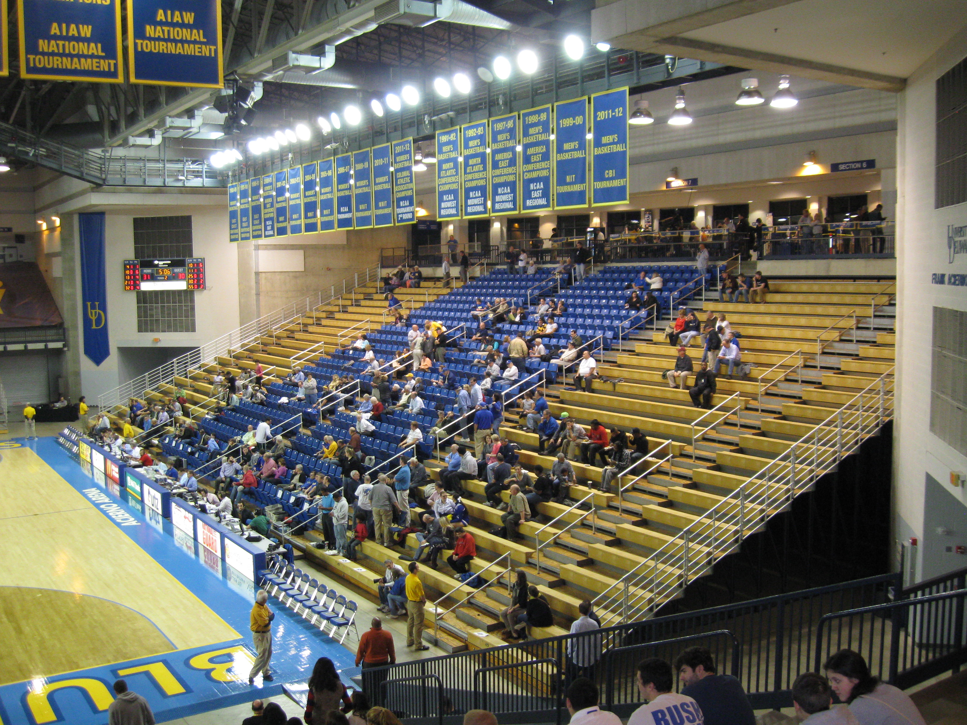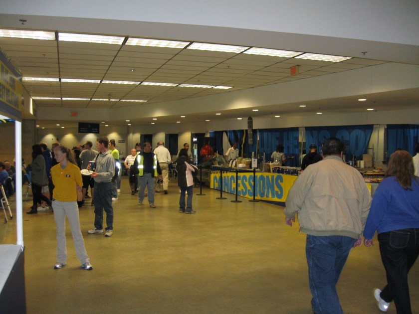A well-lit arena features seating that is semi-permanent as some of the stands are pull-outs. Sideline seating extends to each baseline and goes up about 26 rows. While one side is set in concrete and features all blue folding chairs, the other side is a pull-out structure that has blue seats in the middle and yellow, plastic bleachers in the other sections. They should just make the whole sideline blue back chairs. Corners are left open, while the ends feature a wide T like seating section, only in bleacher form. One end is reserved for students, while the other end is for the pep band and they block off the rest of the seats with a “This is Blue Hens Country” sign (always an indication that the place is hardly full). There is one luxury area, the Bob Carpenter Club, and it is hidden behind windows and above the exposed concourse on the sideline. The place feels small and tight, but overall not a bad arena.
