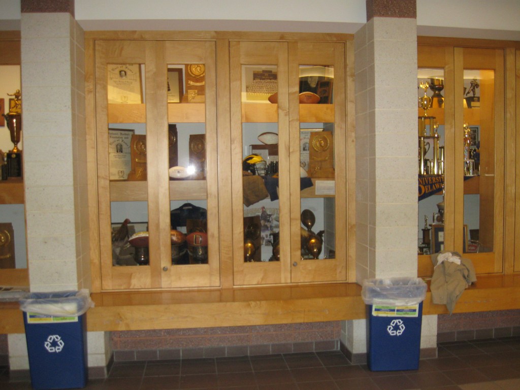 The UD Athletics Hall of Fame on the right wing of the opening atrium is a very nice display with plaques for each member and a huge collage of athletes past and present. One problem is they wouldn’t let me see it as I was politely informed that I wasn’t allowed in the area. Luckily, there are other distractions nearby, including a display/trophy case and a portrait of Bob Carpenter, the namesake of the arena. Inside, the rafters are appropriately filled with blue Delaware banners. Volleyball and Basketball accomplishments are featured with conference championships and NCAA appearances. I wish they didn’t have up the Men’s banner for their CBI Tournament appearance in 2011-2012. Really? Universities seem to honor everything and I don’t think making the fourth-tier post-season tournament is worth a banner. In addition to school accomplishments, team banners for each CAA conference member are hung as well.