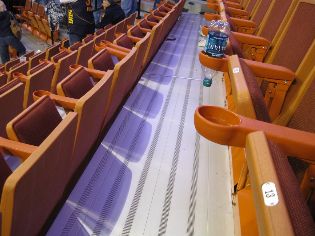 The octagon shape to the arena makes it suited perfectly for basketball and the intimacy of the place helps to accentuate that. Two levels of seating are featured with the dark orange seats in the lower level slightly outnumbering the blue ones in the upper bowl. Seats are a little tight I must say with the skinny arm rest almost making it feel like you are infringing on the person next to you. Much of the lower level is on metal dividers, which cheapens the feel a bit, but was done to allow multiple seating configurations. There is no level of suites at Mohegan Sun Arena, just a lounge-like space built into the back wall above each side of the upper seating. This allows for even better upper deck sightlines. The black wall extends all the way around and starts immediately behind the last row of seats. I’m surprised they didn’t build more suites into this wall as it would be a good spot for them. Overall, I walked away quite impressed with a truly solid basketball arena.