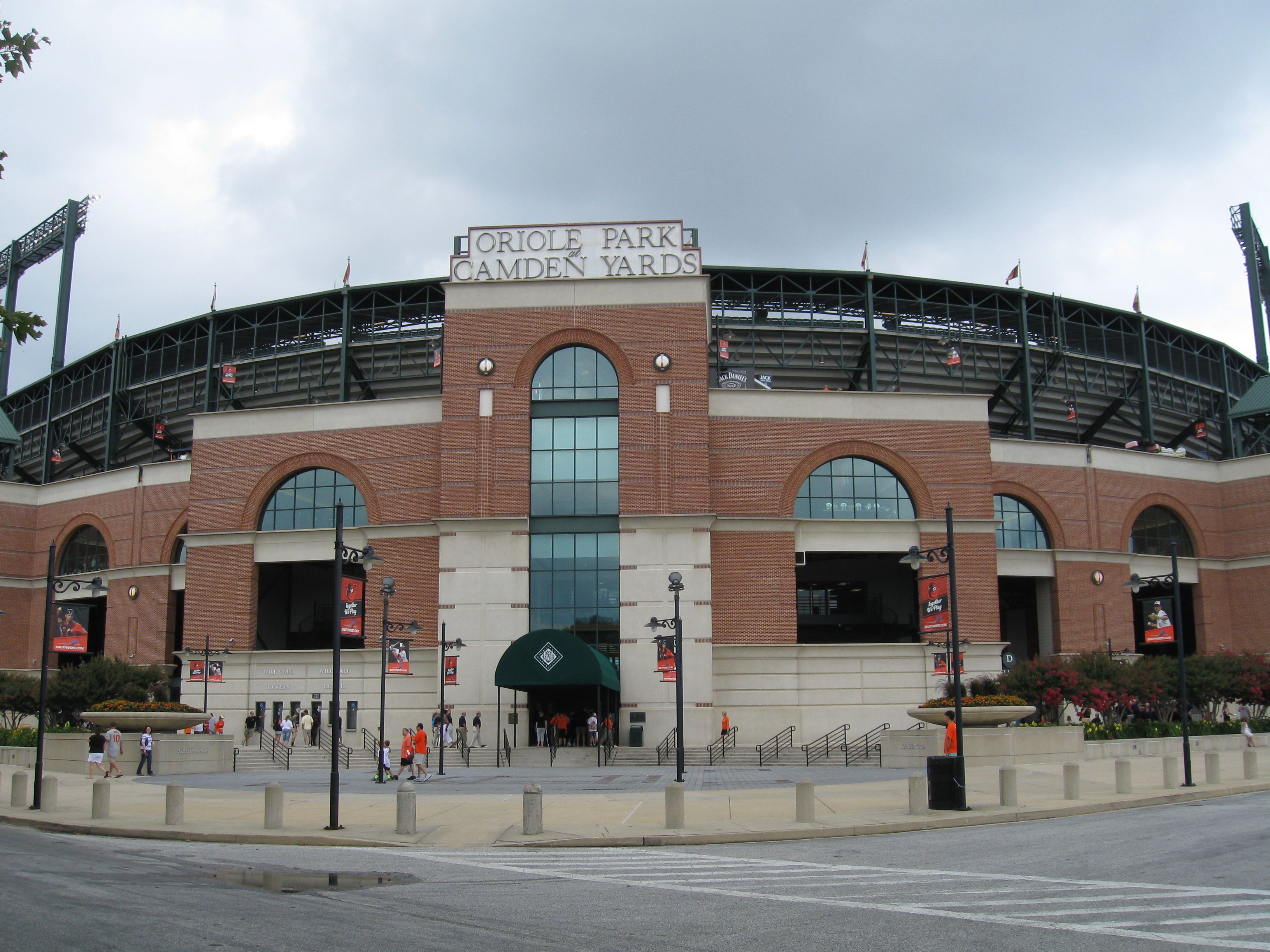 Brick work designed to match the other nearby buildings make Camden Yards a perfect fit for the area and something replicated by others many times over. Walking around the stadium, open archways and green steel trussing is noticeable throughout, while each iron entrance gate has a classy look. Though most will enter the park from the outfield, there is an opening front façade complete with landscaping and a sign at the top of the ballpark saying “Oriole Park at Camden Yards”.