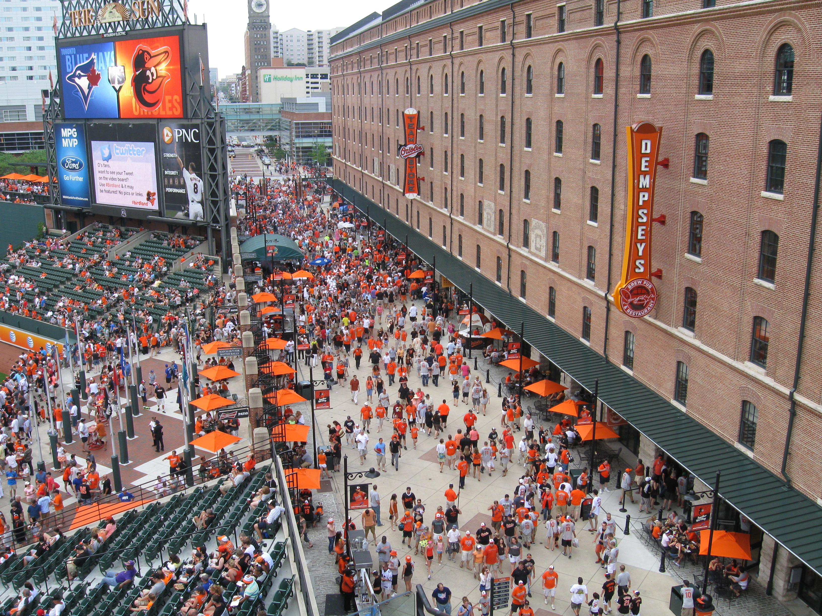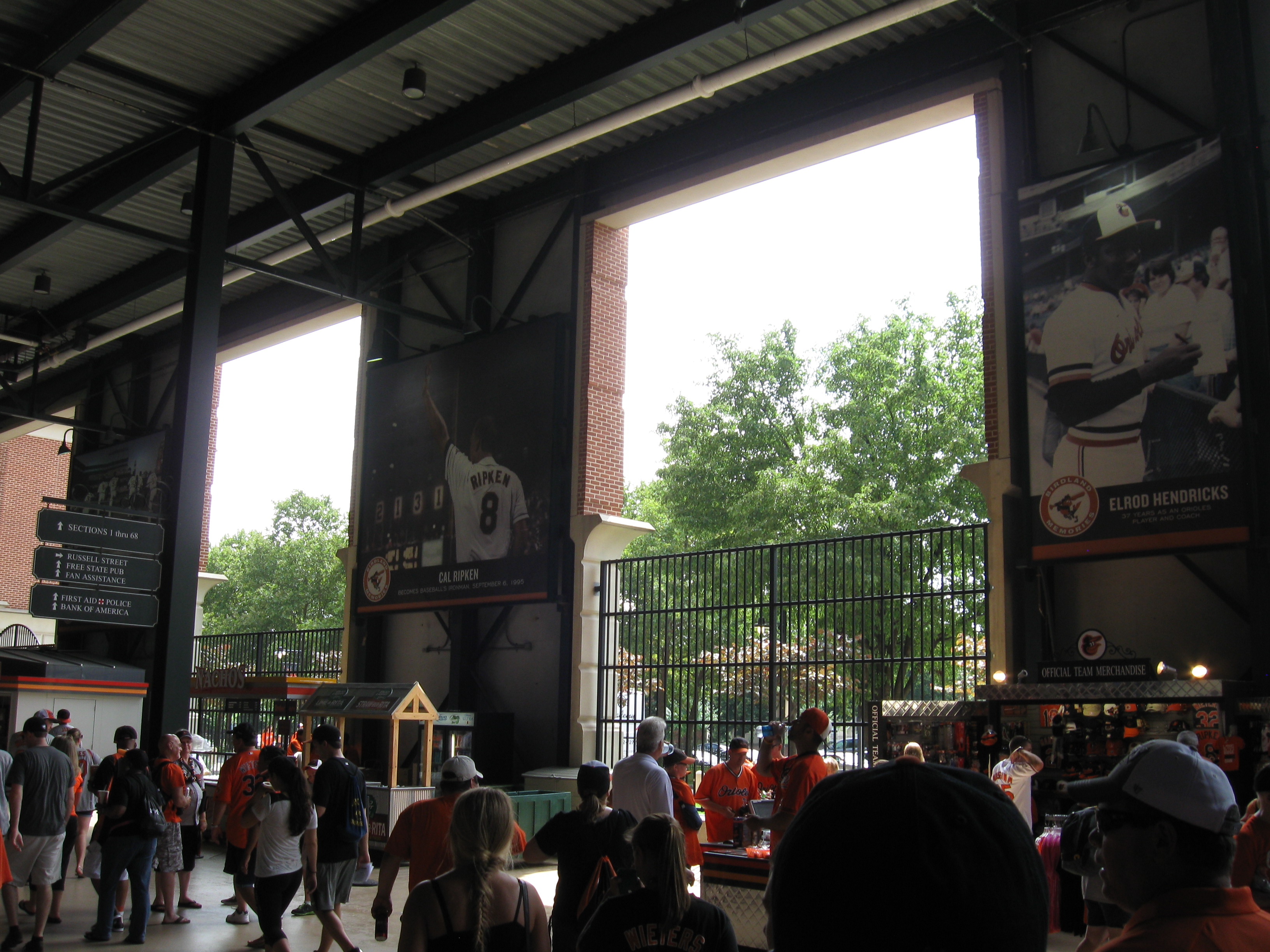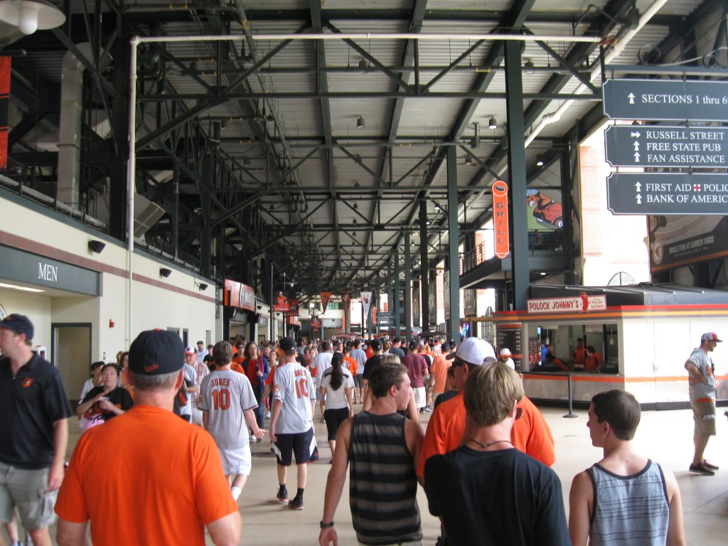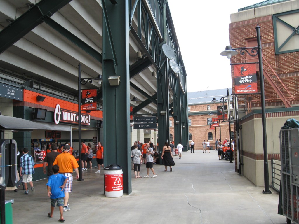 The defining experience here is at Eutaw Street, an open-air section of the ballpark between the outfield and the B&O Warehouse (more on the warehouse later). Crowds well before the game were packed in like sardines, but later on, the area became more enjoyable for a stroll. This section is loaded with specialty food, displays and other eye-catching features. Again, this type of “plaza” has become a defining feature used often with other newer parks. Dempsey’s Brewpub also offers traditional restaurant-style seating inside the first floor of the warehouse. Meanwhile, a branch off of Eutaw is a new outfield plaza filled with picnic tables topped by orange umbrellas and trees for shade. A covered and mostly enclosed concourse then rounds out the rest of the park and there is plenty of room and signage throughout. Much of the space has classy-looking displays, even the entrance to each bathroom is covered with some sort of huge, old-school logo. Stairs bring fans to the upper-deck, while the two escalators are somewhat insufficient based on their location and one-way direction. Once up a level, the concourse surrounds the seats again, this time outdoors. All throughout, there are plenty of places to sit and eat/drink before the game, including three pubs and bars that can be found inside the interior concourse. It wasn’t enough however to reduce a lot of congestion before the game.