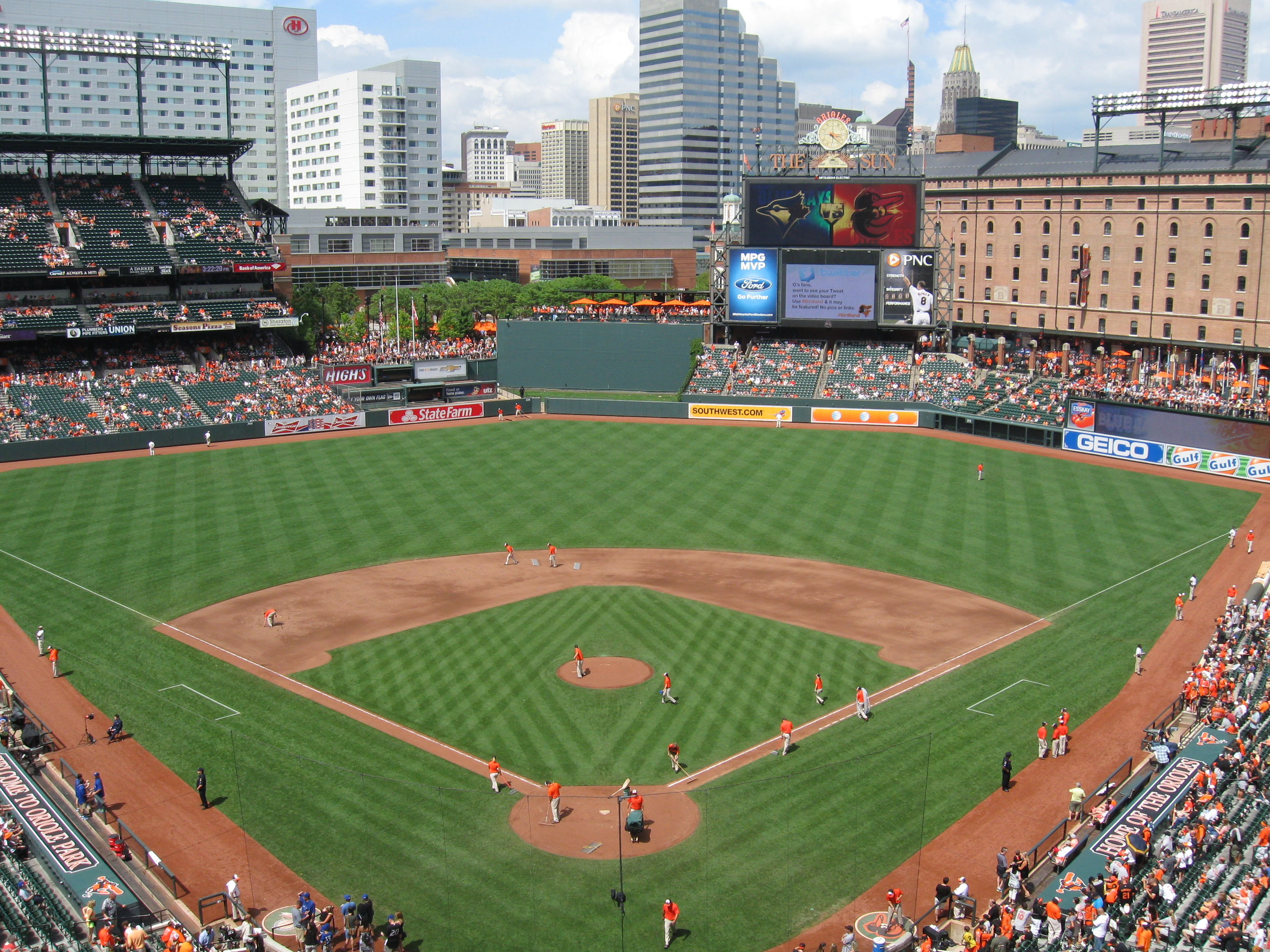 After seeing many ballparks replicate Camden Yards, I finally got to see the real deal as we spent the weekend in Baltimore. The Charm City is the 24th largest in the country with a population of 621,000 and is located in Northeast Maryland on the Patapsco River (which leads into the Chesapeake Bay). This section of the river forms a harbor around Baltimore and it is this Inner Harbor that defines the city. As one of the first urban revitalizations in the 1970s and 80s, it turned the former abandoned industrial site to a bustling attraction. The rest of Baltimore features a mix of some real bad spots and crime-ridden areas, while other neighborhoods in the city are quite nice and worth a visit. The Orioles don’t go as far back as other East Coast Major League teams, though Baltimore had a very successful minor-league team for nearly fifty years, MLB arrived in 1954 and as the team grew into the “Oriole Way”, Baltimore had 18 consecutive winning seasons and three World Series titles (’66, ’70 and ’83). However, with one of the league’s worst owners (Peter Angelos), it has been rough in Birdland as the string of 14 losing seasons was just broken with a playoff berth last year. After spending much of its pro life in generic, yet raucous Memorial Stadium, the Orioles moved downtown to Camden Yards in 1992. Likely the most defining and influential stadium ever built, the strikingly beautiful ballpark still manages to thoroughly impress more than 20 years after it opened.