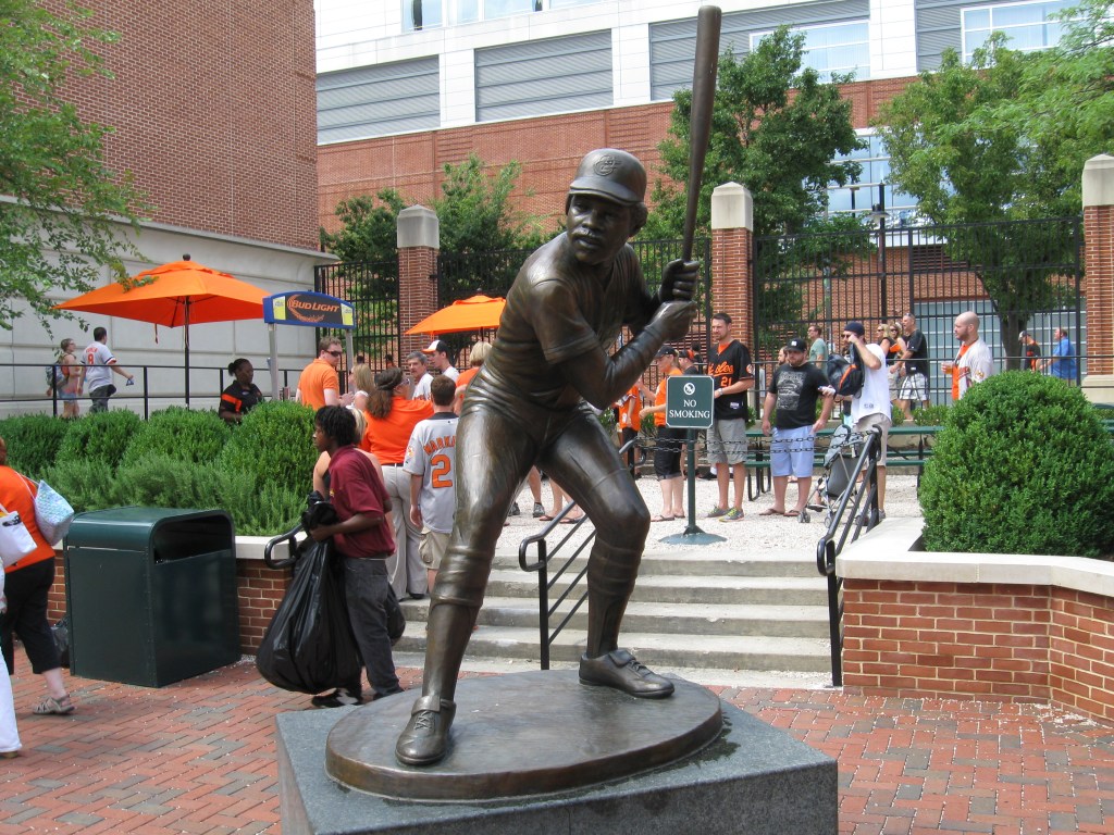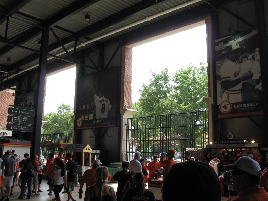 On the approach to the ballpark from the south, there is a tribute to the city’s veterans and a salute to Memorial Stadium on the side of the walkway. Designed in the same font as the front inscription at the old stadium is a display in a half circle that says “Time will not dim the glory of their deeds”…..Last season, the team went back to the cartoon-like Oriole as their main logo, as opposed to the O’s that used to grace their cap……Cal Ripken is undoubtedly the face of the franchise. His family (which includes Dad and Brother that also have roots with the team) is from nearby Aberdeen and one of MLB’s greatest moments occurred on September 6, 1995, when he broke Lou Gehrig’s consecutive games played streak. The Iron Man should not just be remembered for that as he was also one of the team’s greatest players……I often wondered why the ballpark is not just called “Camden Yards”. Oriole Park is attached to the beginning because many of the past fields the team has played in used that name. Their was an argument between two high-ranking people about the name and they compromised by going with both……So why are they known as the Orioles? It is the official state bird of Maryland…..Wild Bill Hagy is part of Orioles lore as he was a superfan and fixture at Memorial Stadium for the better part of three decades…..Speaking of great fans, I have to give it up to Sheila, the usher for our Section 352. She would come down to clap and dance between each inning, was extremely nice and genuinely just had a good time while doing her job…..There are two orange seats amongst the green ones in the outfield. They represent the locations of Eddie Murray’s 500th Home Run and Cal Ripken’s 278th, which broke the record for a shortstop.