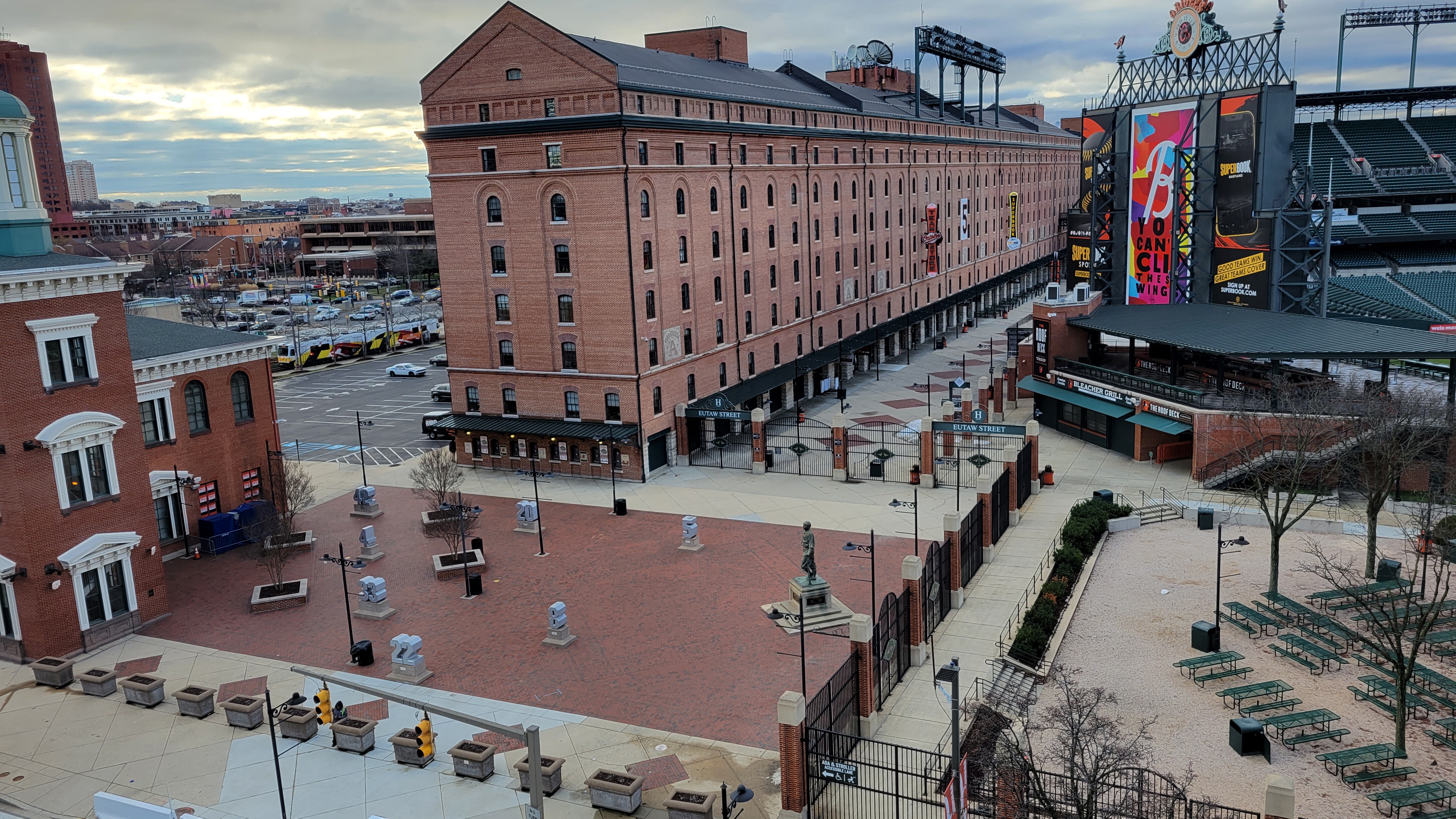 Along Eutaw Street, in addition to black, orange and white pennants for various postseason achievements, the brick walls are adorned with Hall of Fame plaques for both the Orioles and the best Maryland athletes. If the area is not full with people, look down on the sidewalk, where baseball markers denote the location of each home run hit onto Eutaw. Statues have become a big part of Camden Yards, with a couple on the outside (Babe Ruth and Brooks Robinson), while relatively new ones are found in an outfield plaza and they honor each Oriole inducted into Cooperstown. In the concourse, I just love the amount of Oriole displays around, including each outside bathroom wall featuring an old-school team logo. In addition, between each open-air gap in the lower-level concourse, a huge picture from a historic team moment is displayed, along with a caption. Great stuff all around. Visible from the seating bowl are the numbers of Orioles retired by the team. The main missing piece is comprehensive history on the team and that’s getting nitpicky given the concourse banners