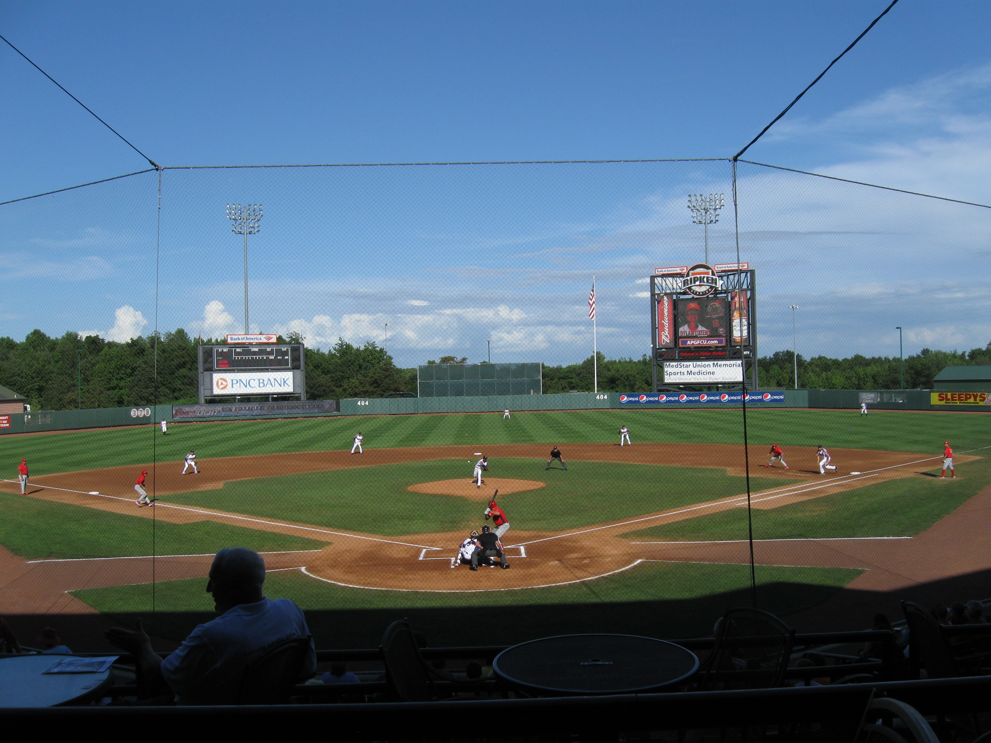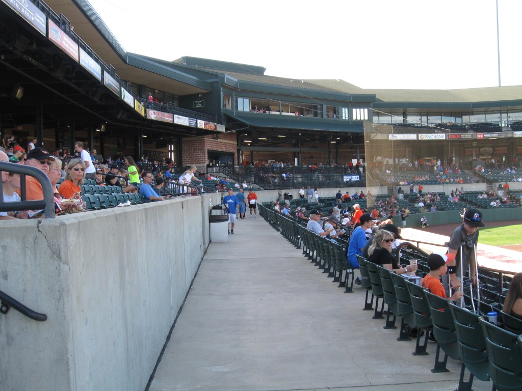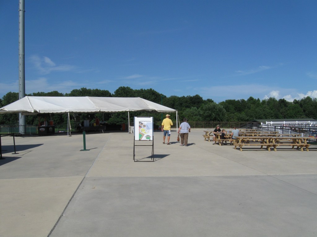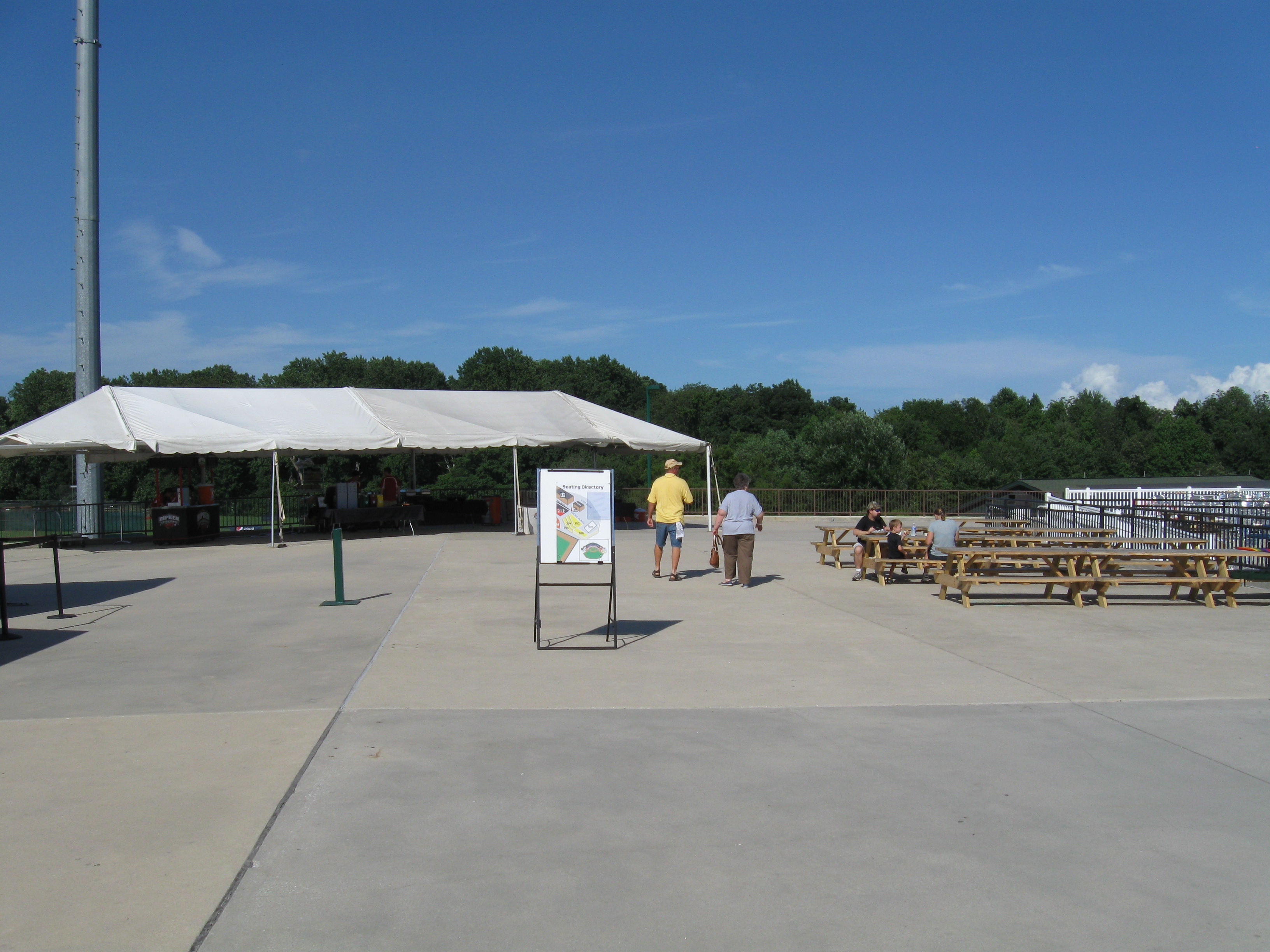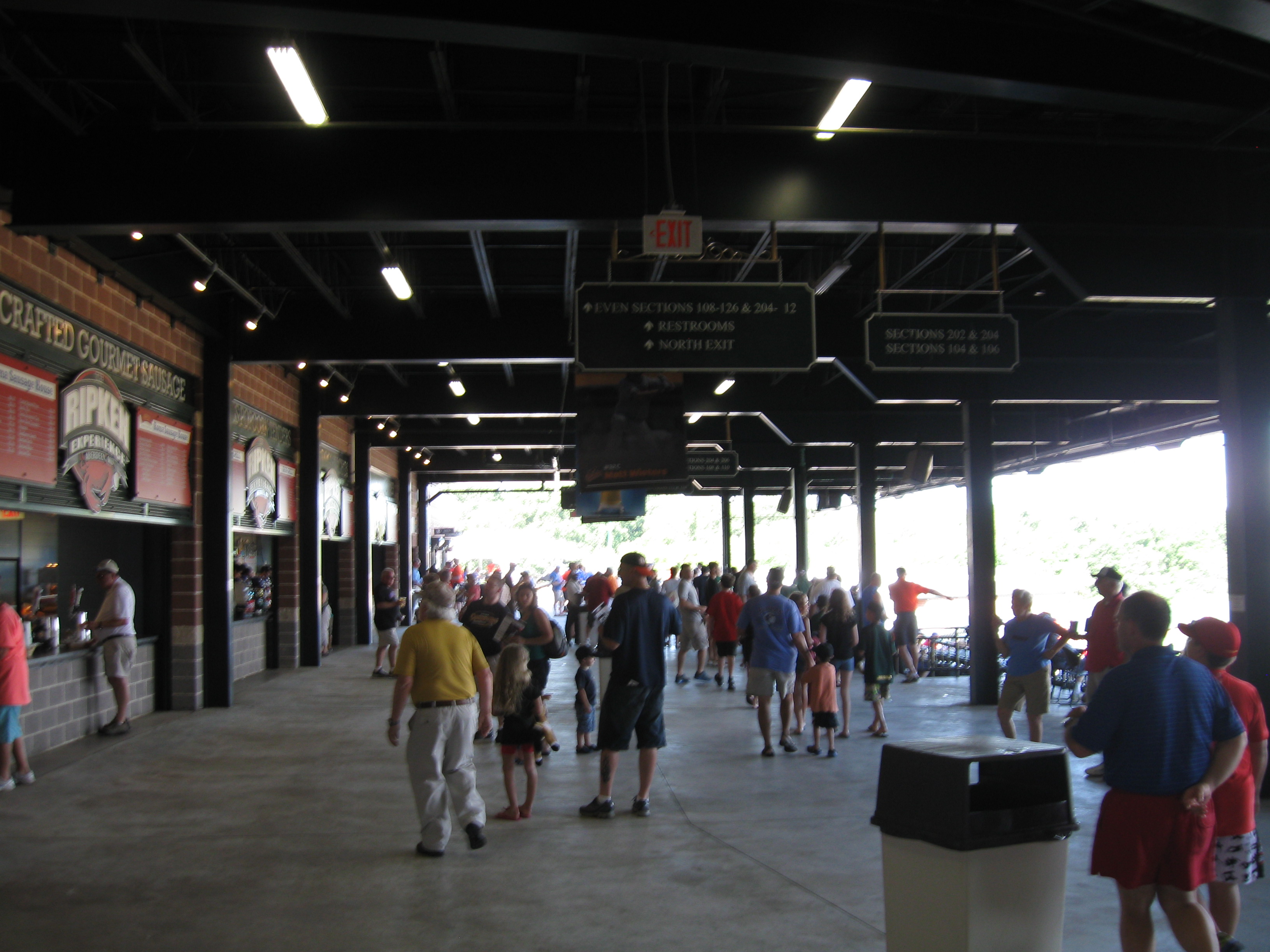 Ripken Stadium features a seating bowl that generally follows the shape of the diamond and ends just beyond the infield. Sections are divided in two with a fairly large walkway splitting the lower 100s and upper 200s. Not sure why there needs to be that much separation in a stadium seating 6,000. All of the seats are green and at the end of each lower section, the seats are nicely turned so they are pointed more towards the infield instead of just looking straight to the outfield. Behind home plate in the 200s is a club box section, which for $28 includes patio seating along with food and drink. Seems nice, but I’m not a fan of these behind home plate. Suites and the press box are perched over the concourse, while additional picnic plazas can be found at the end of each part of the seating bowl (where they belong). Though it is good not to see a hoard of advertisements in the outfield, the look past the wall is boring with not much to see besides distant trees. Overall the ballpark is decent, but I just wasn’t all that wowed and there seemed to be a lack of character.