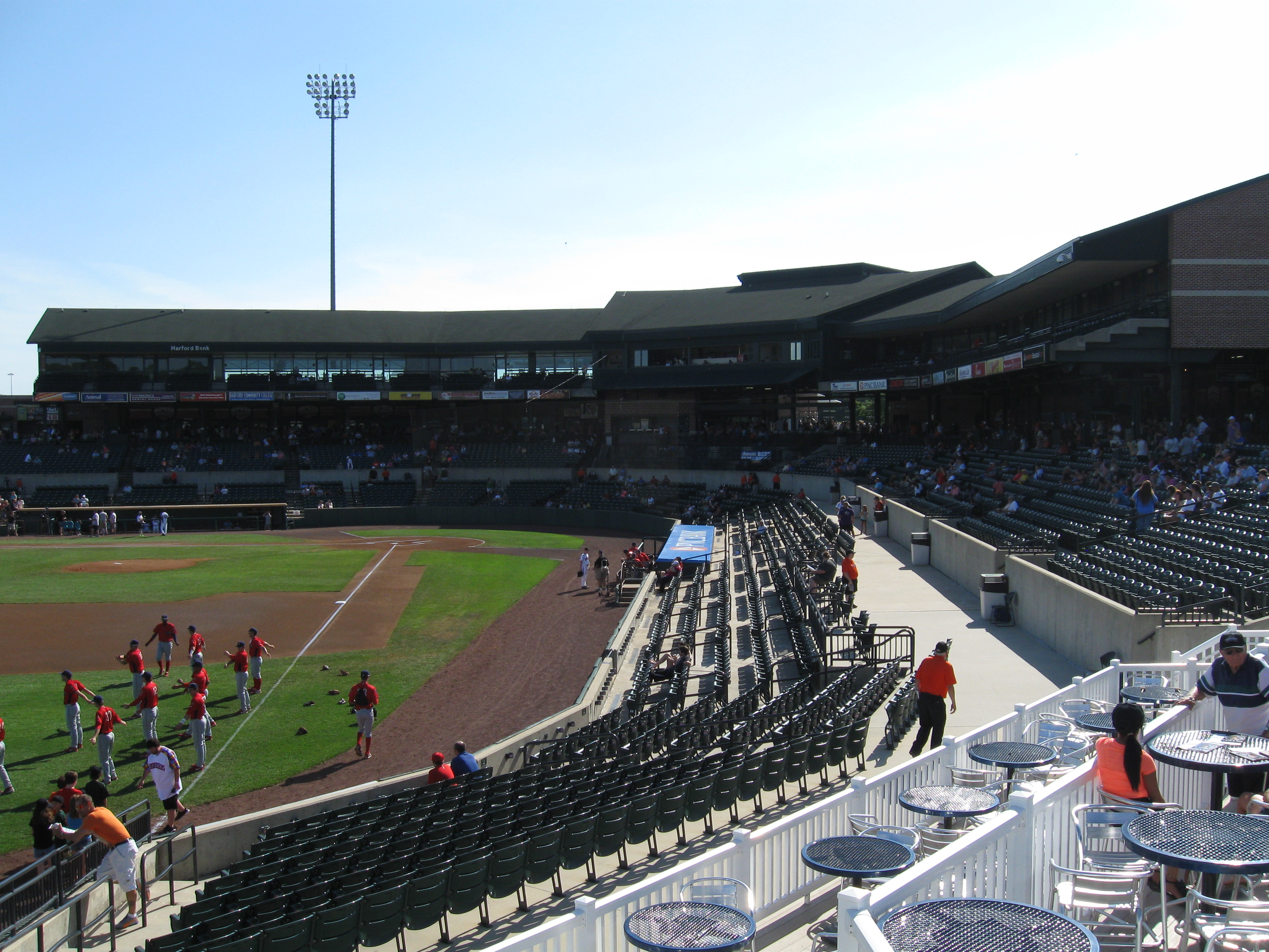 Ripken Stadium is just a small part of what has become an expansive and significant youth complex. Known as the “Ripken Experience”, the complex includes seven ballfields used for youth tournaments, clinics and camps. The anchor stadium is Cal Sr.’s Yard, a 2,000-seat ballpark designed just like Camden Yards and it even has a hotel in right field that looks similar to the famous B&O Warehouse. The ballpark also plays host to the Cal Ripken World Series each year, which is part of the Babe Ruth League…..Aberdeen’s team store is called “The Hangar” and it is quite large with a lot of goods, comparable with a team higher up in the minor-league food chain…..So how did the IronBirds name come about? Since Cal Ripken owns the team, his nickname was the Iron Man while he played for the Orioles, while the team nickname is the “Birds”…..Speaking of Cal, I know it is sacrilegious to talk bad about him, but seriously seeing his name plastered everywhere is annoying. I understand the whole branding aspect of his company…but jeez, from the stadium to the team name, to “Ripken Experience” signs on the concession stands and scoreboard. Even the team shop had a special Cal Signature Series. Enough already!…..I definitely have my doubts on the team’s listed capacity as 6,300. A few months earlier, I was at the ballpark in New Britain, which has a smaller capacity yet was bigger than Aberdeen’s.