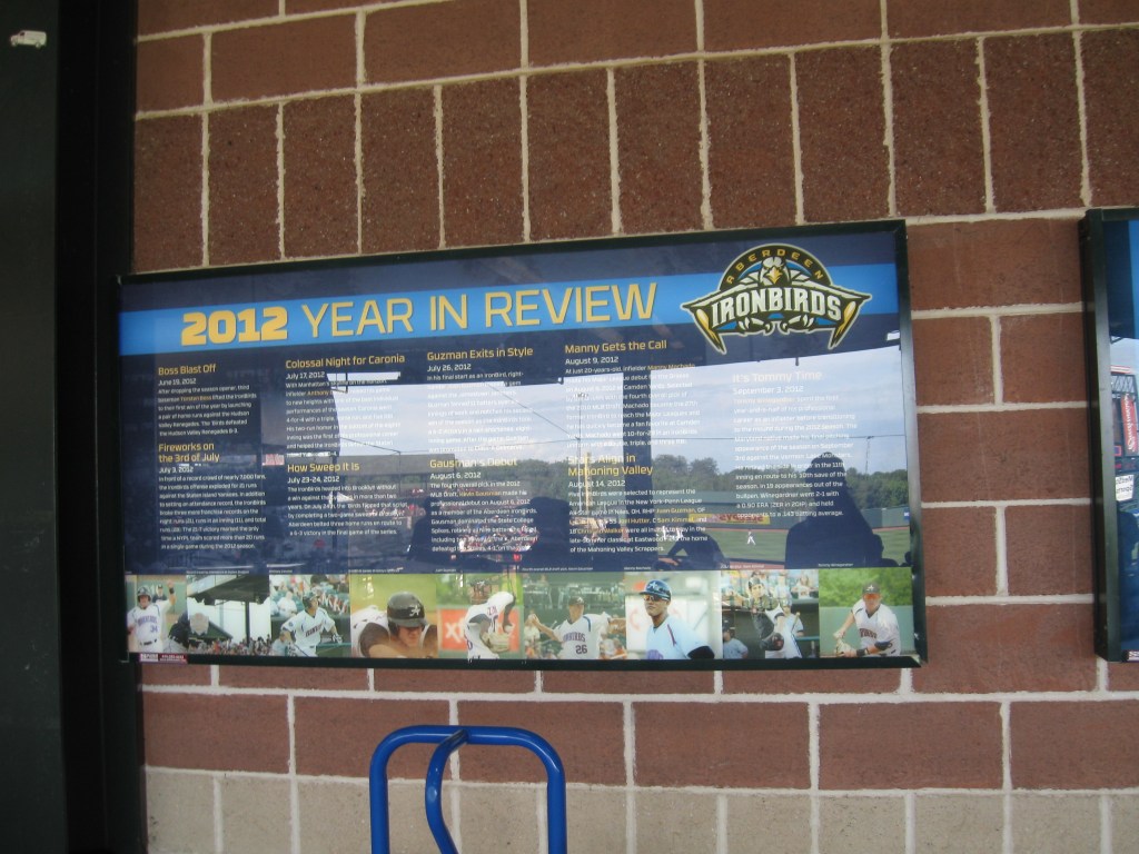 Hanging from the ceiling in the concourse are posters showing former Ironbirds that have gone on to play for Baltimore. It’s always fun to see these current big-leaguers when they were baby-faced and just getting their professional start. There is also a concourse display featuring a year-in-review for the IronBirds season. On the outfield wall is where the numbers 3, 7 and 8 are located and they are for all three Ripkens (Cal Sr, Billy and Cal Jr). Given that the stadium seems to be all about them, it is a bit surprising there is not more information on the trio.