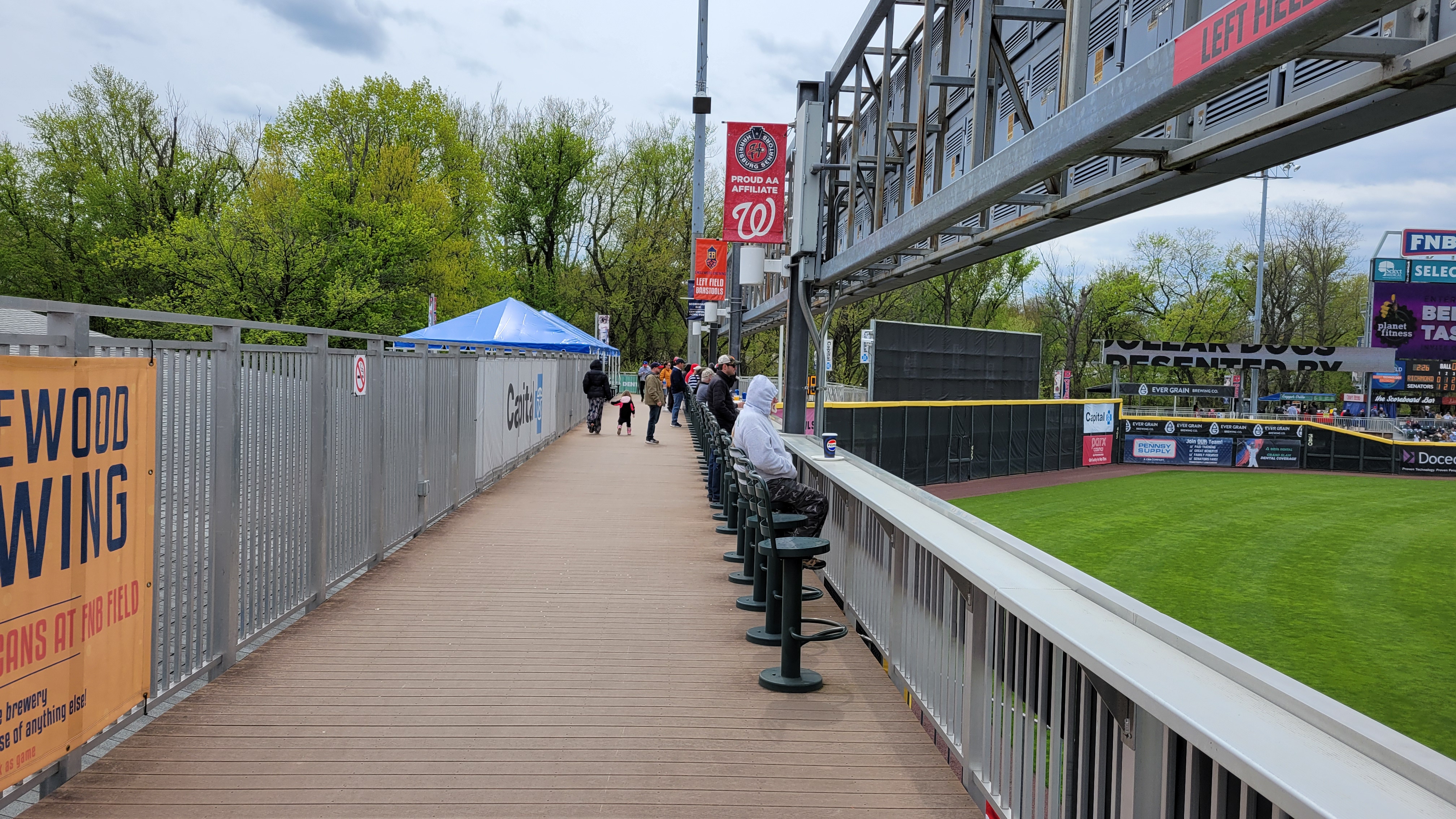After passing through the main turnstile, an open-air section includes picnic tables, a large team store building and a concession stand featuring “The Spot” (where I had a delicious Rendell Burger) before leading to the nice “Boardwalk”. With more picnic tables along the side, the walkway straight ahead leads to the seating bowl and then acts as the space splitting seating levels. Branching off to the left while near the main entrance, the boardwalk is 360 degrees as it goes all around the outfield. Along with being able to stand and see the game, there are bar-style chairs with counter-top seating. Both of the mentioned areas also include some remarkably close spots to each bullpen. Back behind the main stands of seating, there are two levels of concourse and a plaza behind the first base bleachers that has a lot of open space and includes a Kids Zone. The underneath concourse behind home plate is quite dark and mainly empty, while a level above is a more traditional spot that features the usual amenities. There is also a decent view of the river and downtown. The only thing preventing a perfect rating is the desolate and dreary space behind home plate at ground level.
