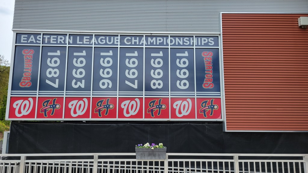 Frequenting the ballpark in the warm weather are mayflies and these insects are so prominent that they are even incorporated into the team’s alternate logo. They are harmless, but can become quite plentiful and annoying on a summer night. Given that I’ve been here for games during the day, they were never a problem for me…..Flooding can be an issue on City Island and in September 2011, the Susquehanna had severe flooding, which inundated the ballpark. It forced the team to move their home playoff games…..In 1999, the Senators had one of the most incredible walk-off hits of all-time. In Game 5 of the deciding championship series, the team trailed Norwich 11-8 in the bottom of the 9th with two outs. Milton Bradley came to the plate with the bases loaded and on a full count he hit a Grand Slam to win the team’s fourth straight title in remarkable fashion……Special thanks to Nate DeFazio on the first visit.
