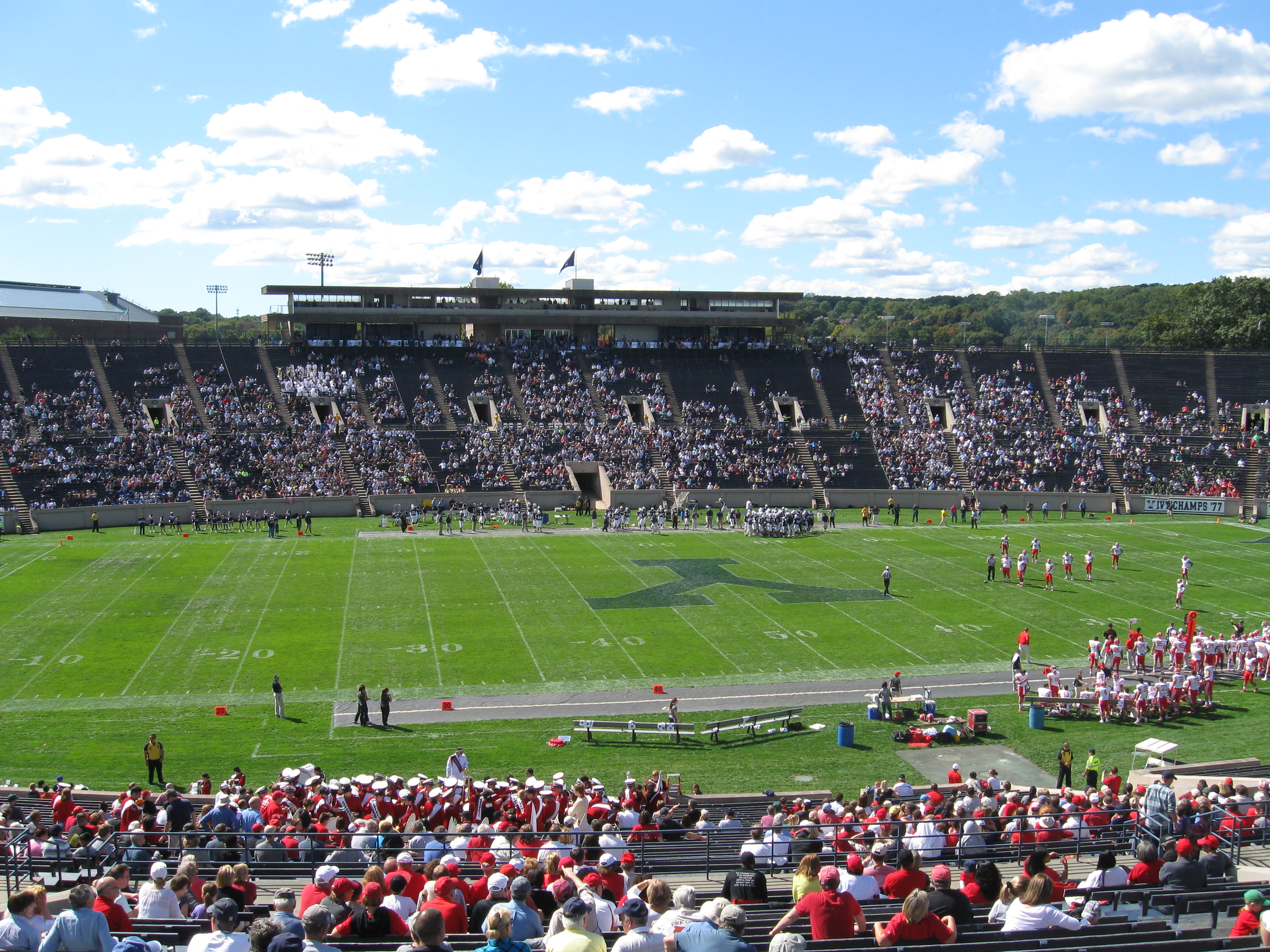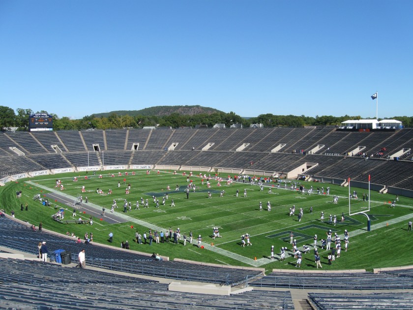 In a time where top college football teams are in an arms race to make their stadium bigger and better, it was refreshing to make another visit to the Ivy League and a Yale football game. Yale’s historic campus is intertwined with the city of New Haven, Connecticut’s second largest city located close to the Long Island Sound with a population of 129,000. The third oldest university in the country started in 1701 and can count five Presidents as part of its alumni. Along with the architecture, Yale is home to several museums and theatres that attract visitors. The biggest sport at the school is football, which has been played since 1872. The Elis dominated for their first 60 years with countless wins and terrific players (including Walter Camp). Even after the formation of the Ivy League in 1956, the Bulldogs took home 14 championships, with the last one coming in 2006. In 1914, Yale introduced the first ‘bowl’ shaped football stadium as the Yale Bowl opened. While the history, significance and uniqueness of this place is great to experience, the inside is crumbling despite renovations in 2005. Chipped and in some cases, broken wooden seats make viewing a game not enjoyable.