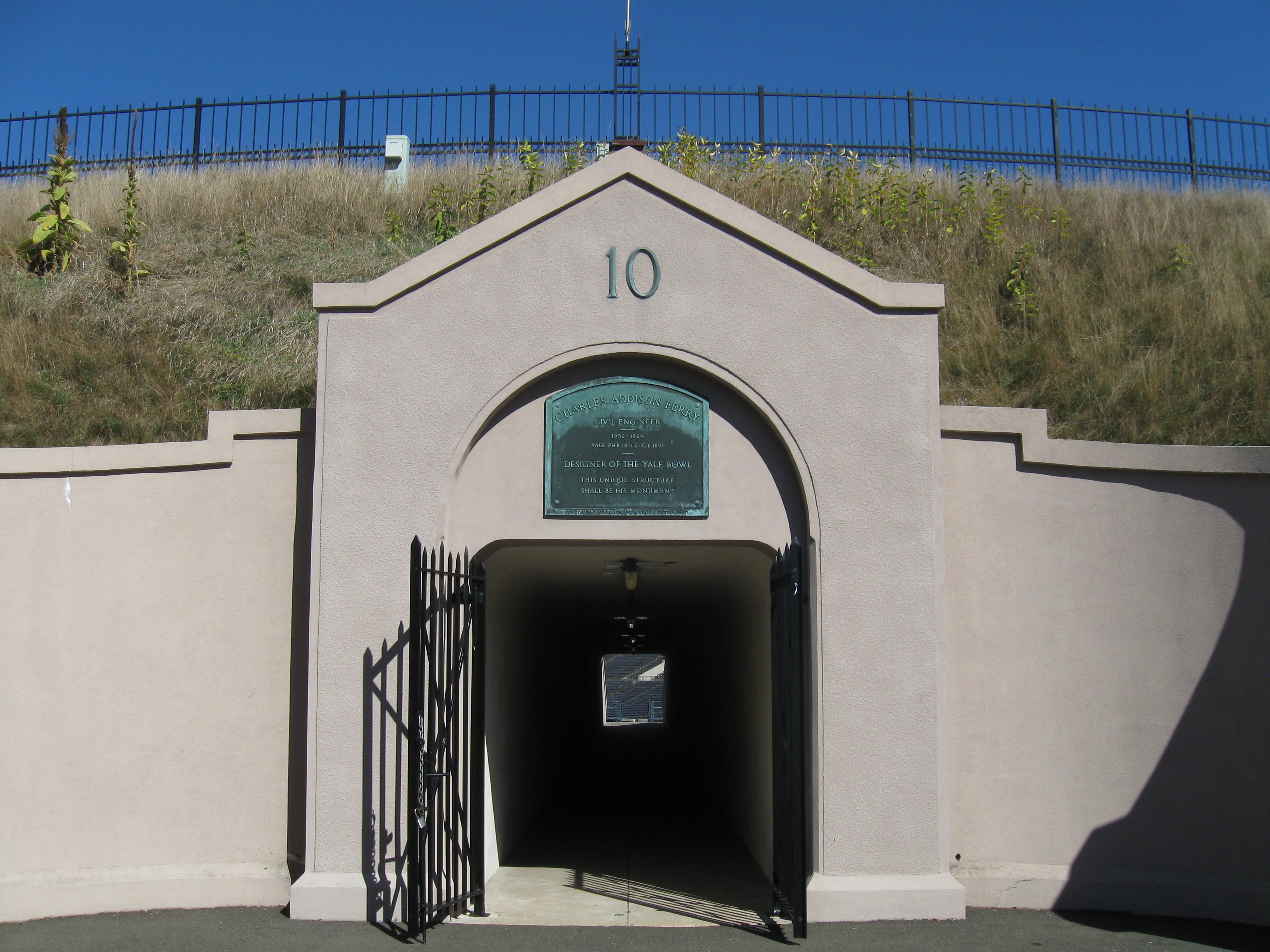 Though most fans will not see it or walk through it, the Walter Camp gate is a Greek-like structure off of Derby Ave that leads to one of the entrances. Otherwise, the main area with the displays is in the Jensen Plaza, where a bulldog statue guards the entrance. The plaza includes bricks featuring the name of every football letter winner. A couple of other plaques are on the outside walls, including one for designer Charles Addison Ferry. Inside, the walls behind each end zone feature 14 “Ivy Champs” banners.