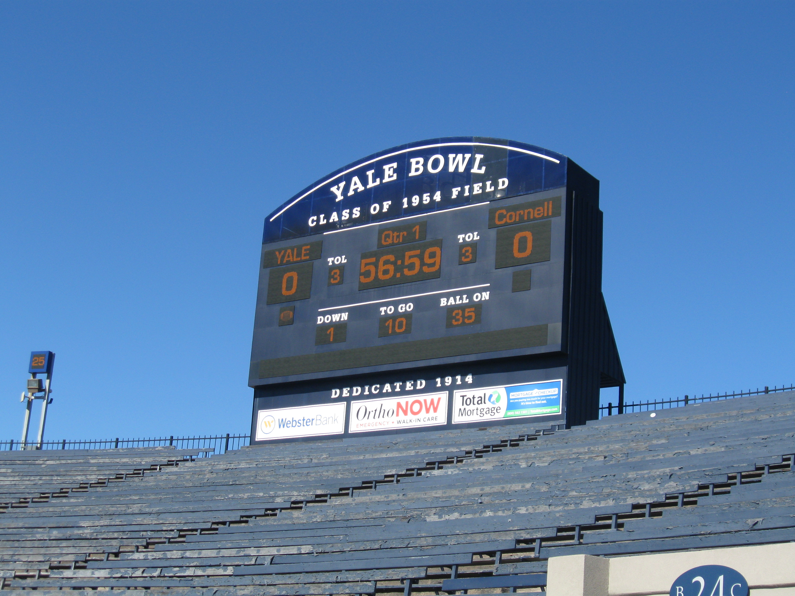 On top of the north end is a relatively new blue scoreboard. Simple and efficient, the scoreboard gives basic info and has a scrolling message board at the bottom. “Yale Bowl, Class of 1954 Field” is spelled out at the top. It is odd not to see a game clock at the other end, which really puts that offensive team at a disadvantage in an end of half situation. Plus, no video.