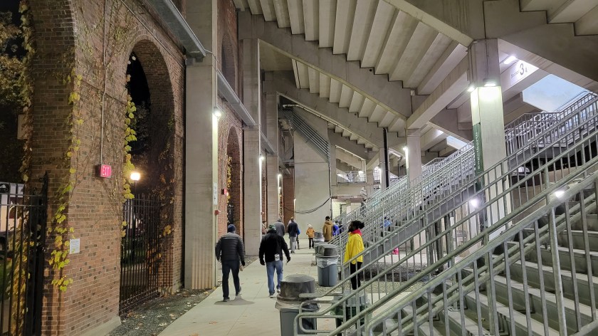 Resting right along Crosby Street is the brown brick structure that holds the West Stands. The flat design is made all the better with ivy on the walls and the timing was perfect with leaves ranging from yellow, orange, brown and red both on the wall and ground. Open archways looking into the concourse line the entire length and at the middle above the entrance is an original looking inscription saying “Memorial Field”. The outside fit the whole setting perfectly.