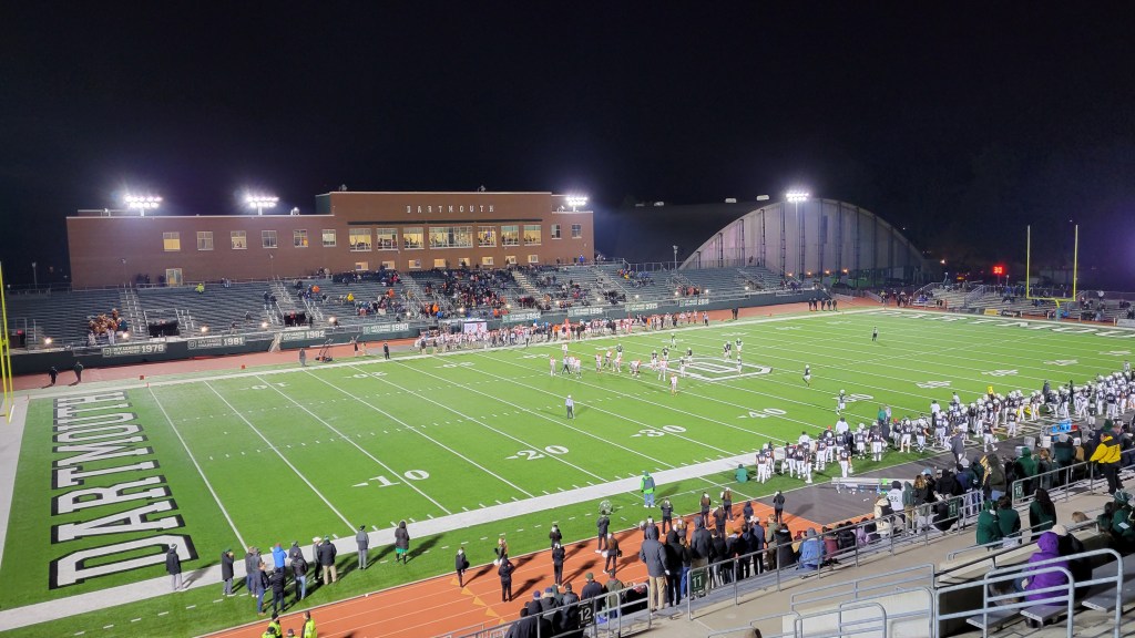 During a weekend trip to Vermont, we hopped over the state border into Hanover, NH, where the Dartmouth football team played their fifth game of the season on a perfect fall afternoon. Located in the Upper Valley region of New Hampshire, the small college town of 11,000 is quintessential New England. With the surrounding hills, nearby Connecticut River and wonderfully charming downtown, Hanover is a great place to stroll through. Dartmouth takes up much of the town and the relatively small (6,000 students) Ivy League school has done quite well after humble beginnings. The history on Dartmouth’s football team goes all the way back to 1881 and the program has flown under the radar despite 17 Ivy League Championships (the last one being a shared title in 2018). The Big Green play at Memorial Field, a stadium built in 1923 and just oozing nostalgia near the main gates. Inside, is a more modern facility and taking in a game here is a very pleasant experience. In 2021, After a visit to the hockey arena, I was able to walk across the street and catch the second half of a Friday Night game against Princeton.